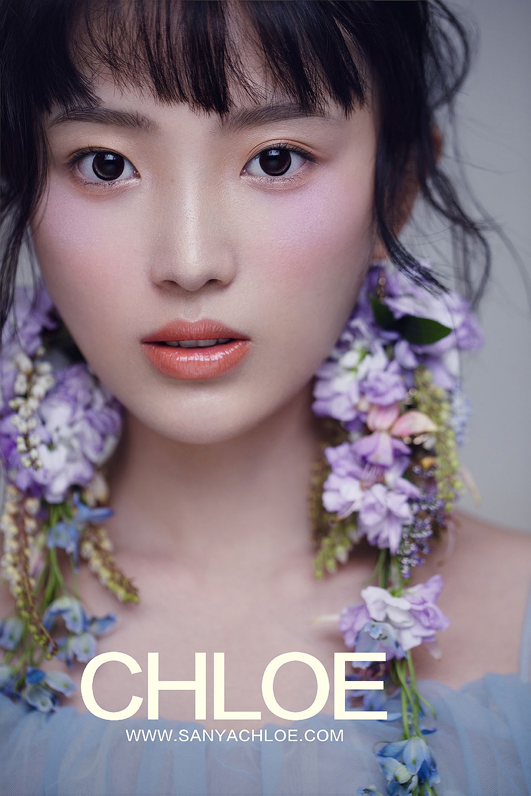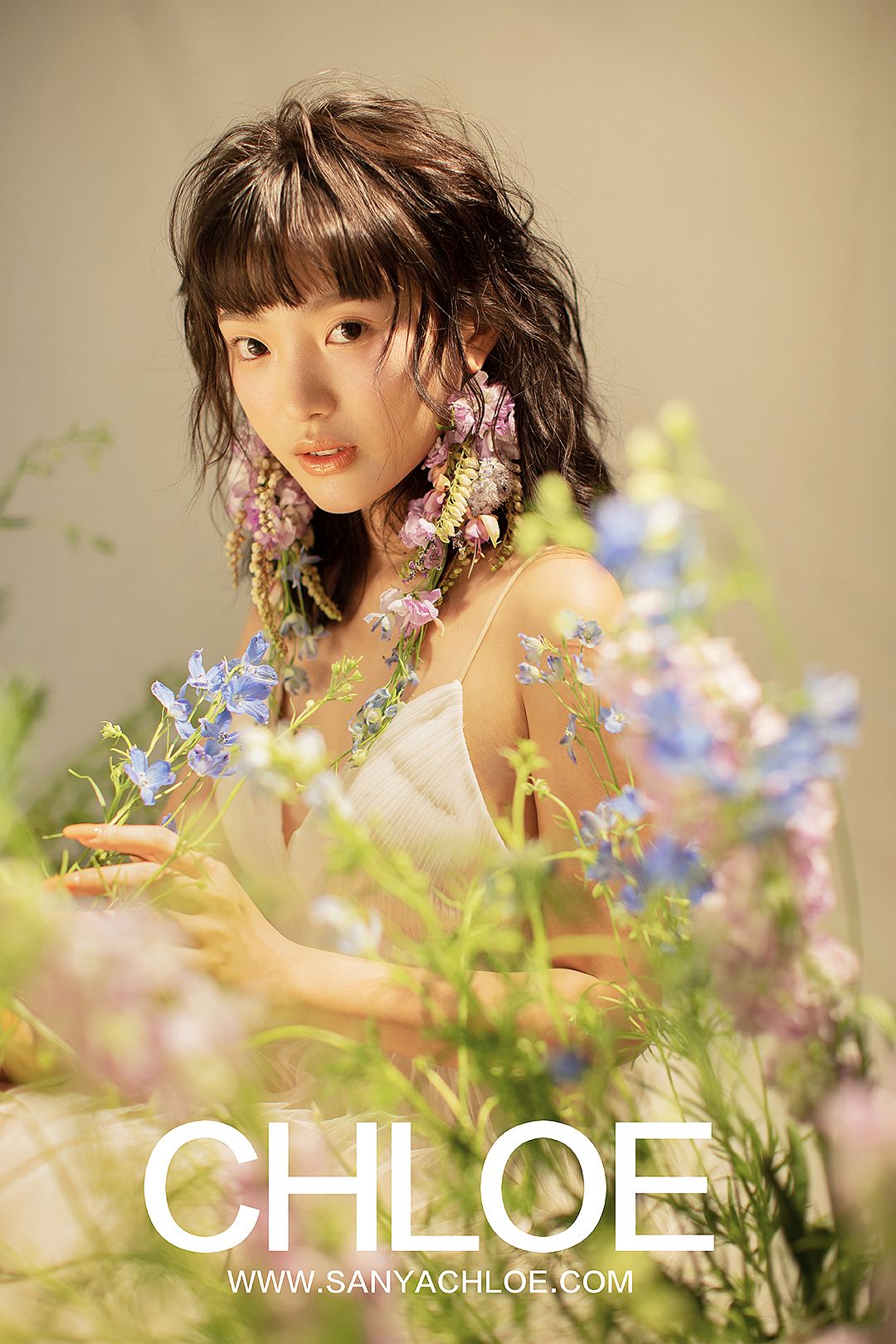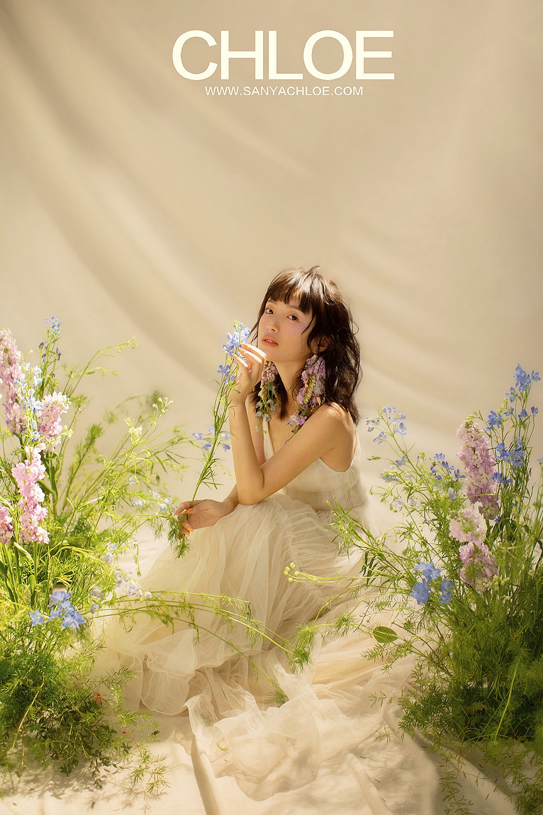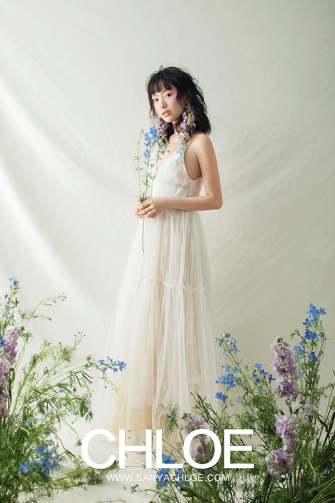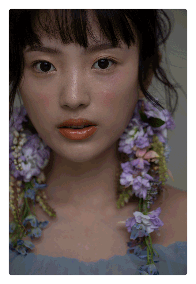 根据模特小姐姐的造型,造型颜色整体偏紫色和蓝色的呈现,李明哥老师配合造型搭建场景。呼应鲜花耳饰,一丛丛鲜花花丛出现在了拍摄现场,制造一个身临花间的唯美场景。
