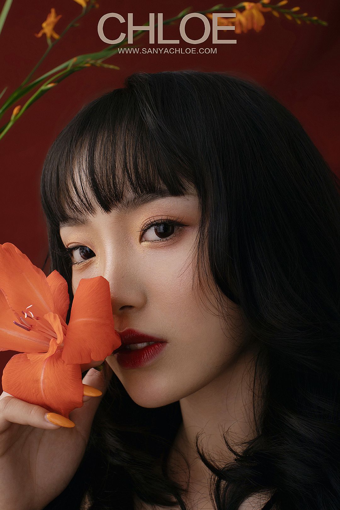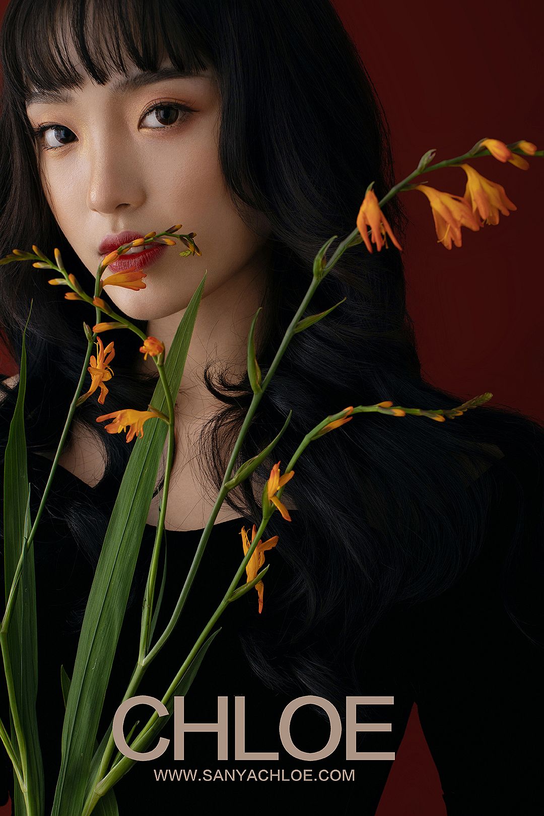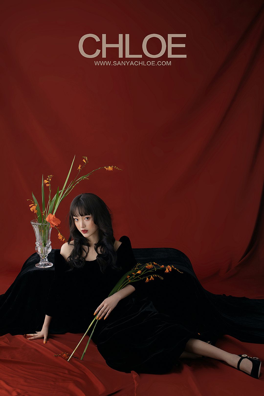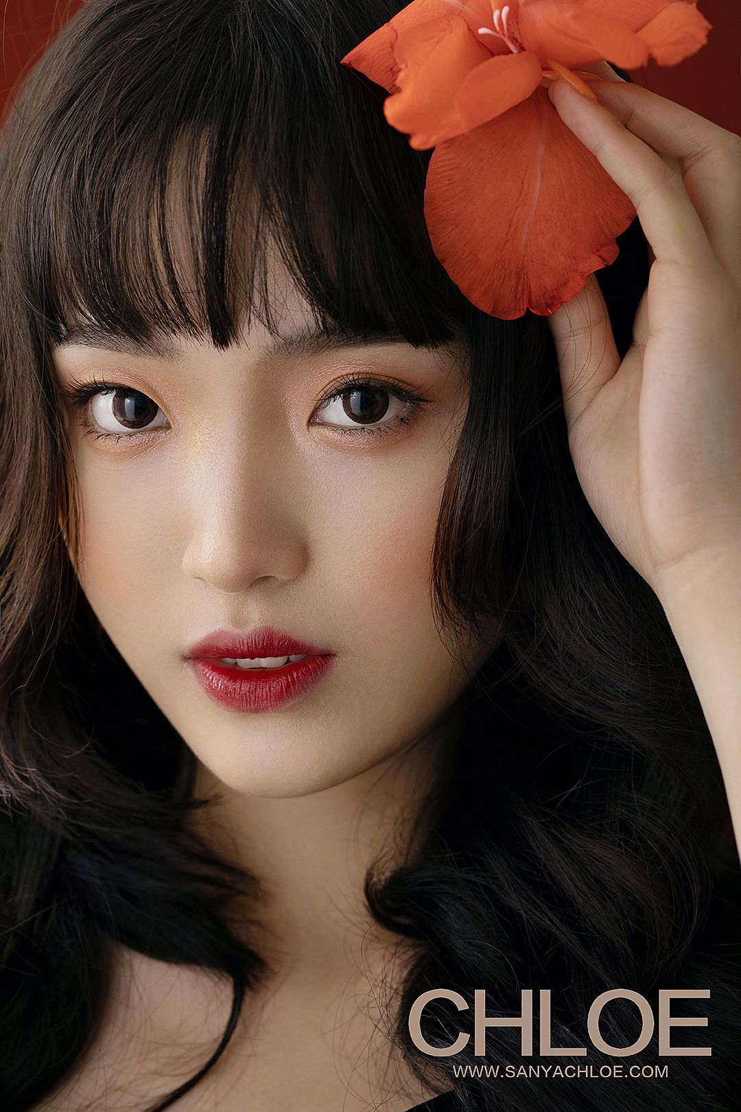 红色的背景,更加能将模特的妆容造型与气质衬托。复古时尚的拍摄元素在于妆容上的红唇、红色背景与红色鲜花的呼应。