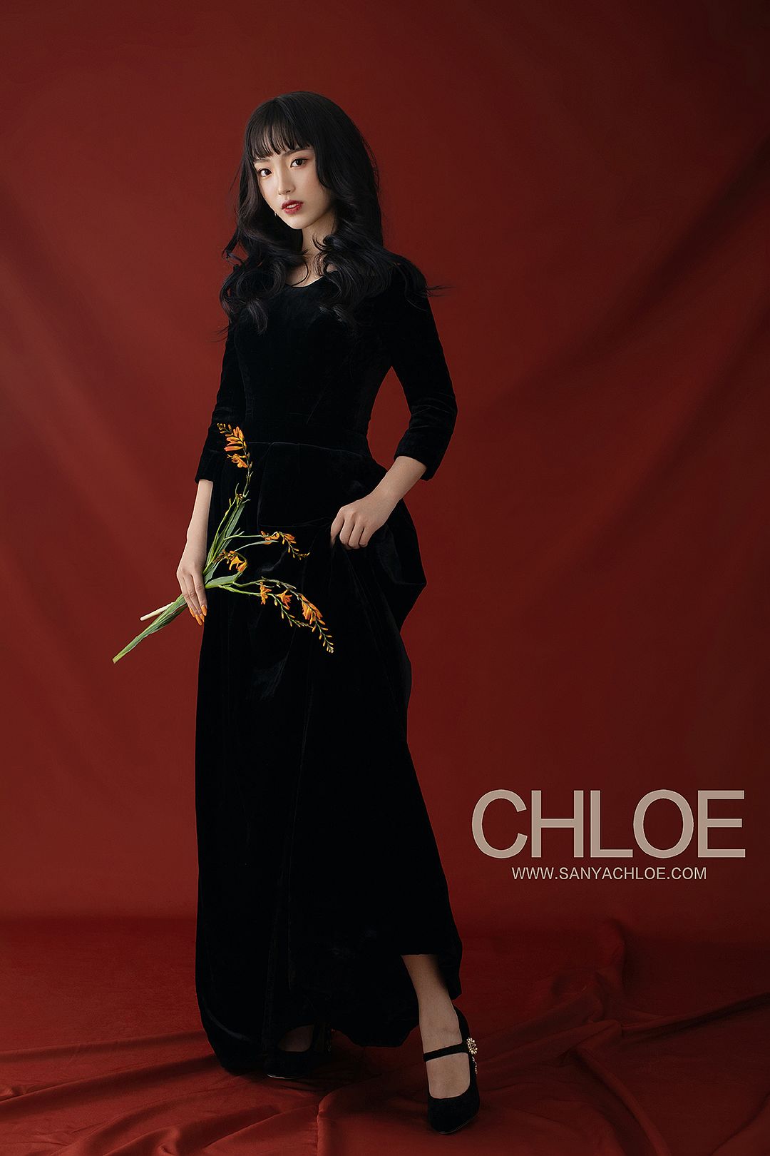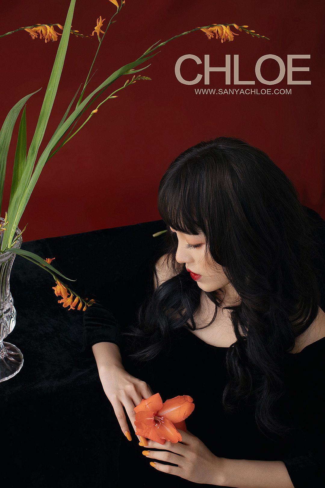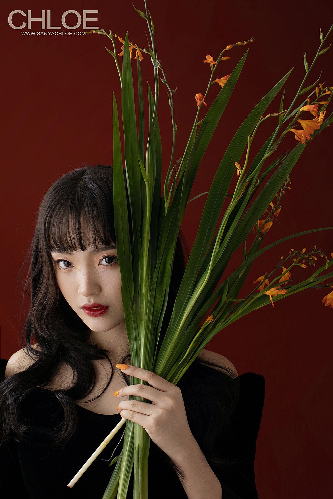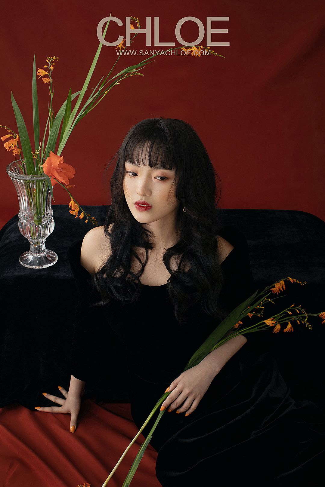 红色的背景,更加能将模特的妆容造型与气质衬托。复古时尚的拍摄元素在于妆容上的红唇、红色背景与红色鲜花的呼应。
