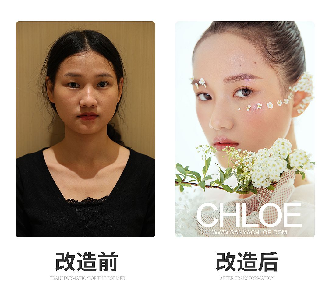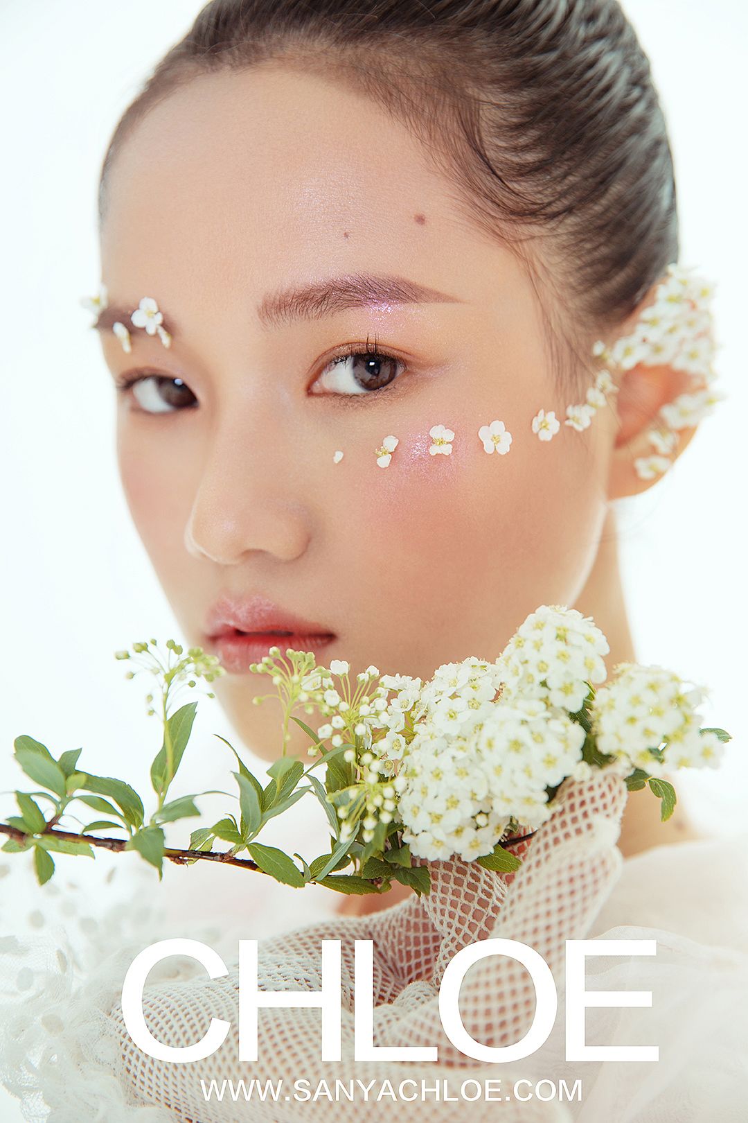 在鲜花饰品的创作上,造型老师们的创意真是层出不穷,在这次的造型里,肆子老师雪柳花用胶水贴于耳部,打造新式贴花耳饰;顺着脸颊延伸出一条贴面花线,简约不简单的鲜花贴面妆容就打造完成啦~