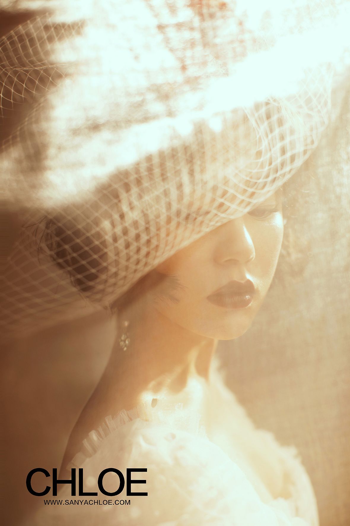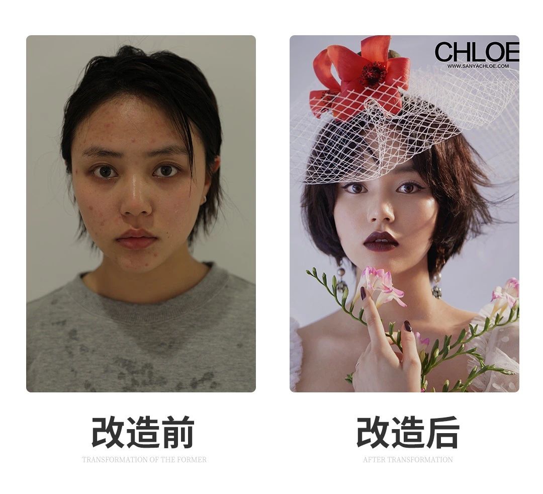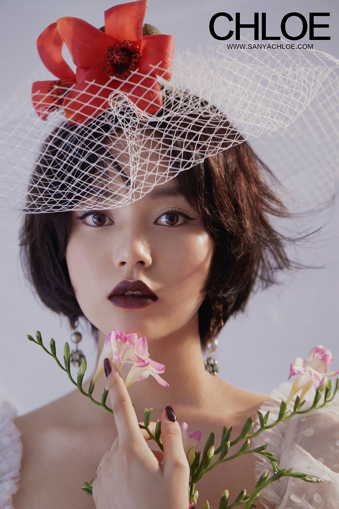 发? 型:轶楠老师给模特小姐姐戴上半截式中长发发片,为了达到造型呈现一个理想效果,不惜将假发修剪出合适的长度;直板夹内外反卷做出好看的造型纹理,发型喷雾稍加定型,半遮脸式法式小头纱加上大朵的木棉花,秀场潮妆造型完成~