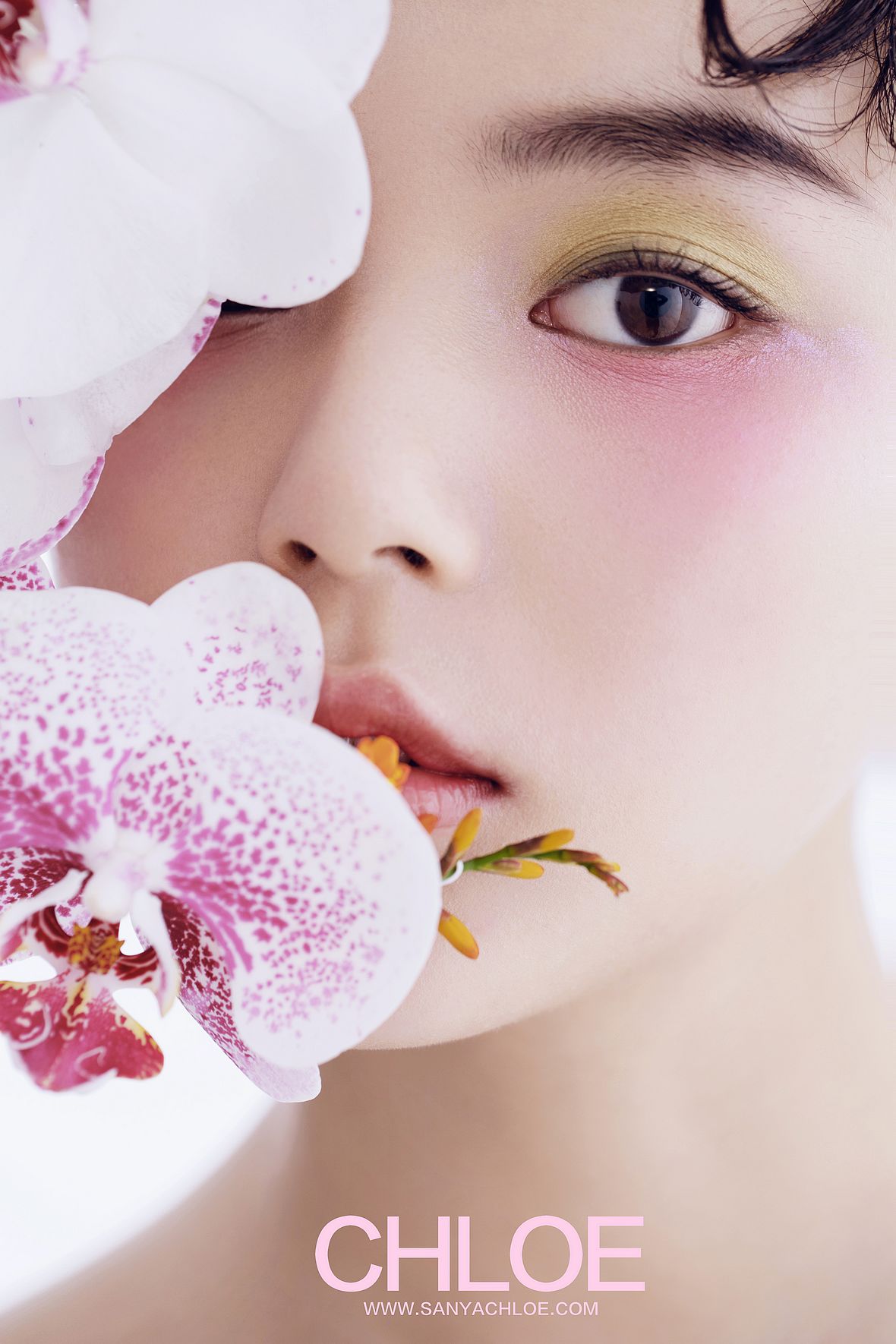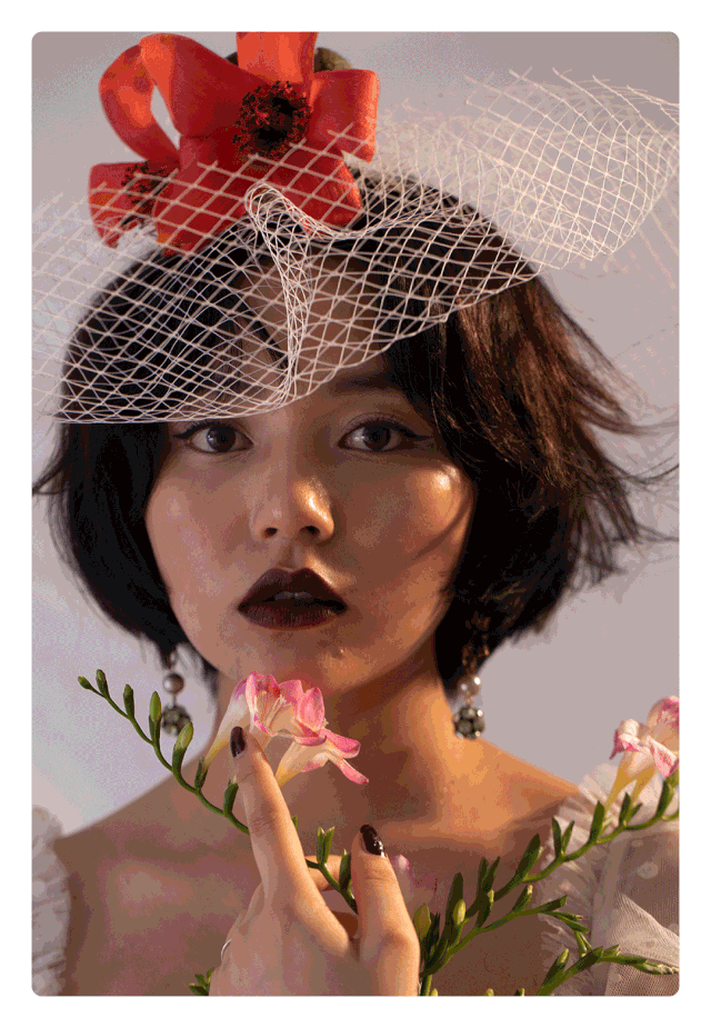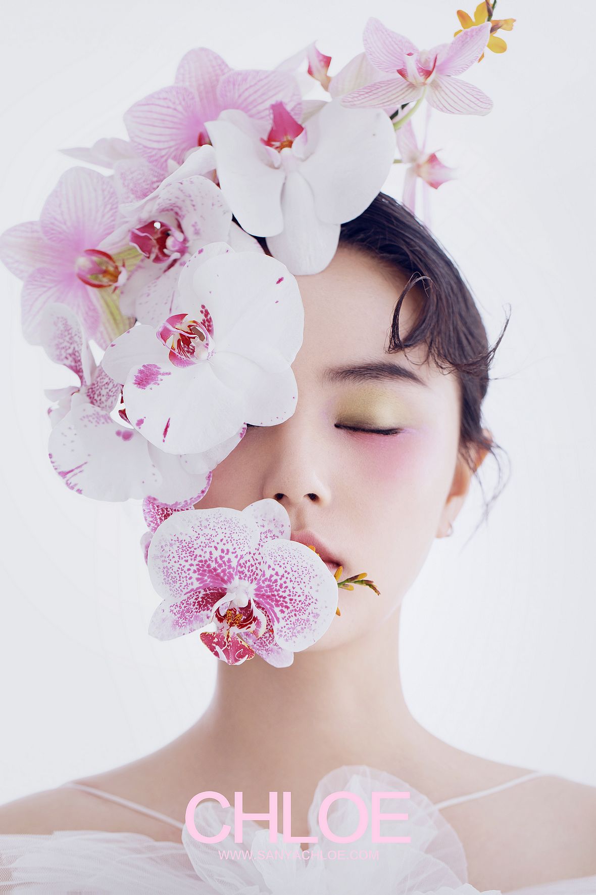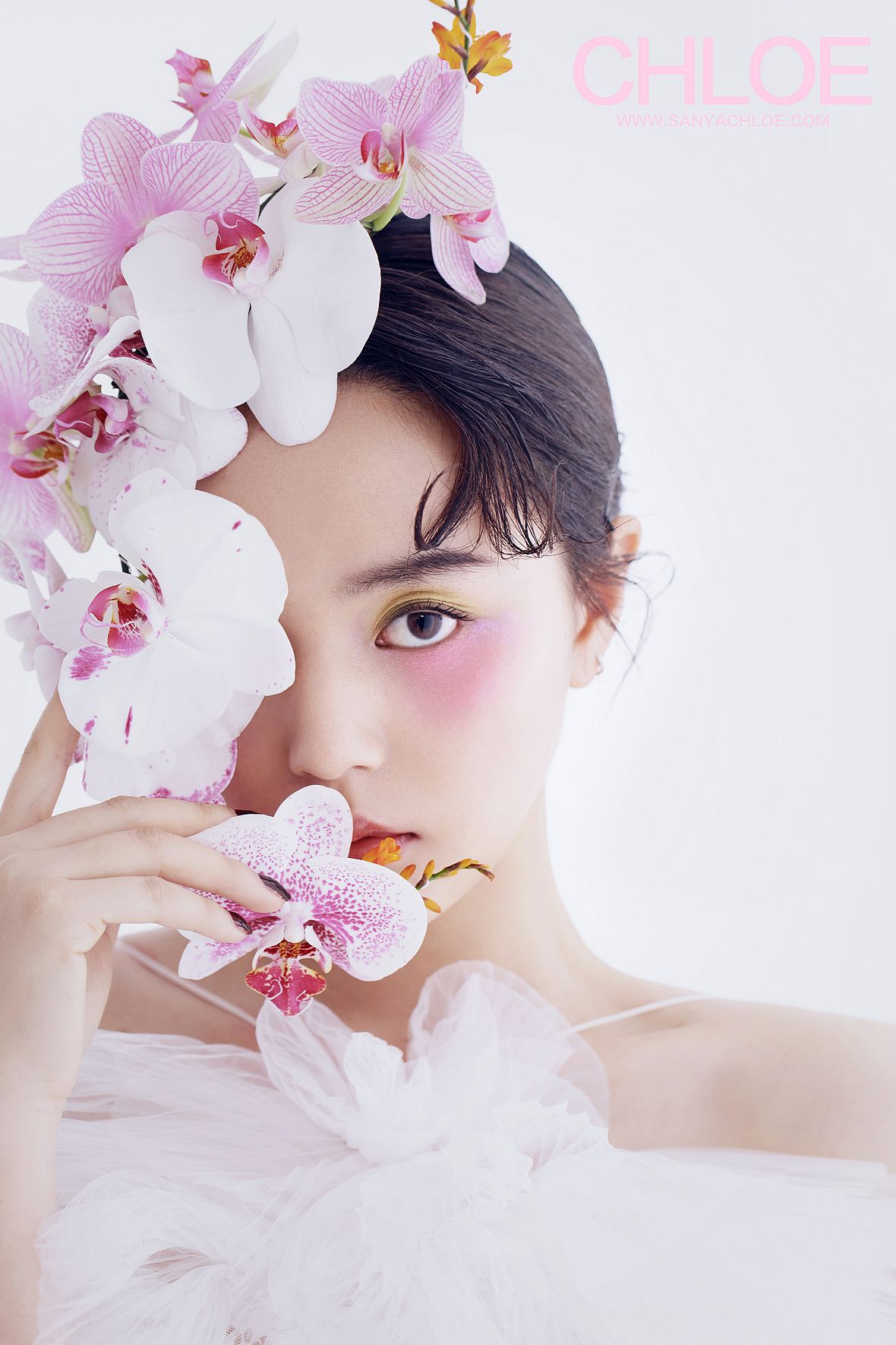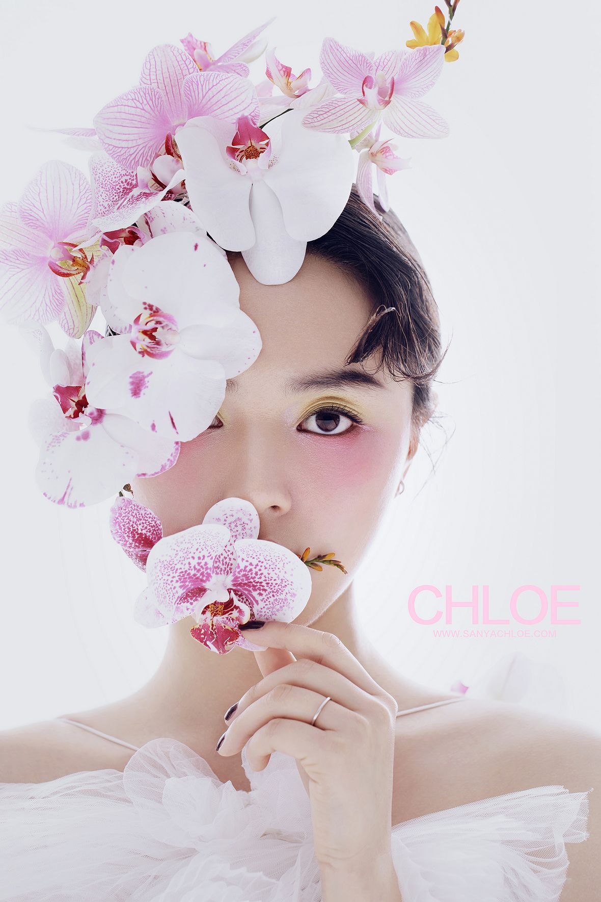 为了贴合主题,轶楠老师再次炫技,亲手制作蝴蝶兰鲜花配饰,大面积装饰在脸部一侧,这样一个大胆创意的搭配,是轶楠老师一直想要突破的传统认知里面的复古造型。