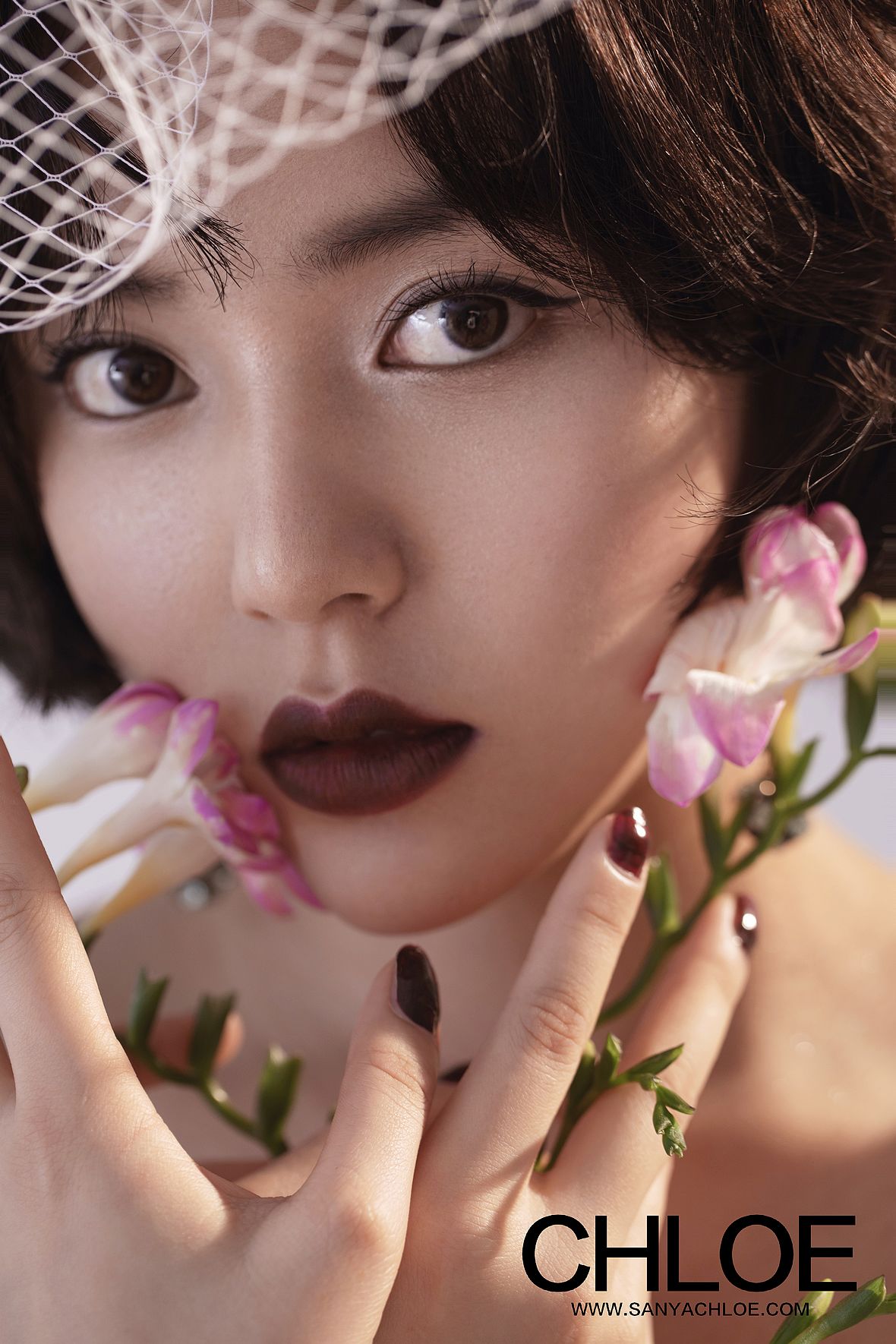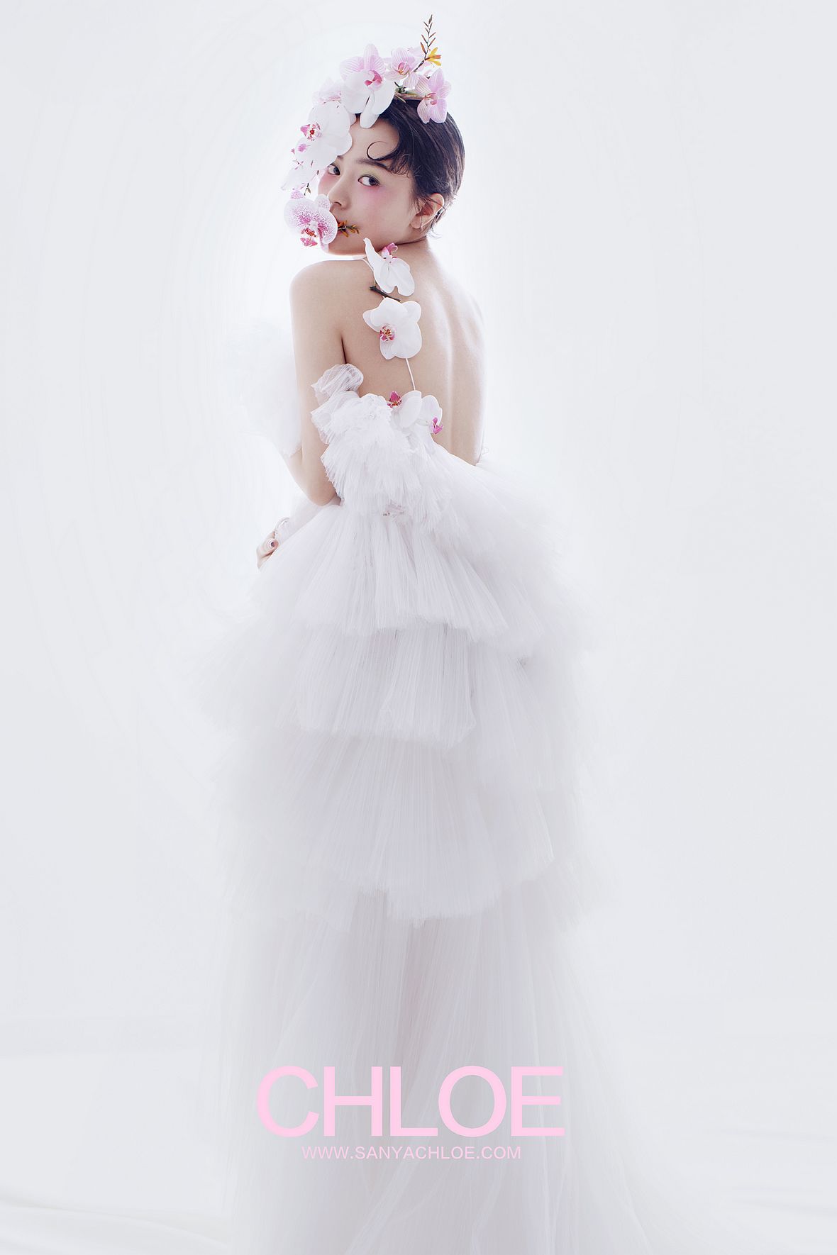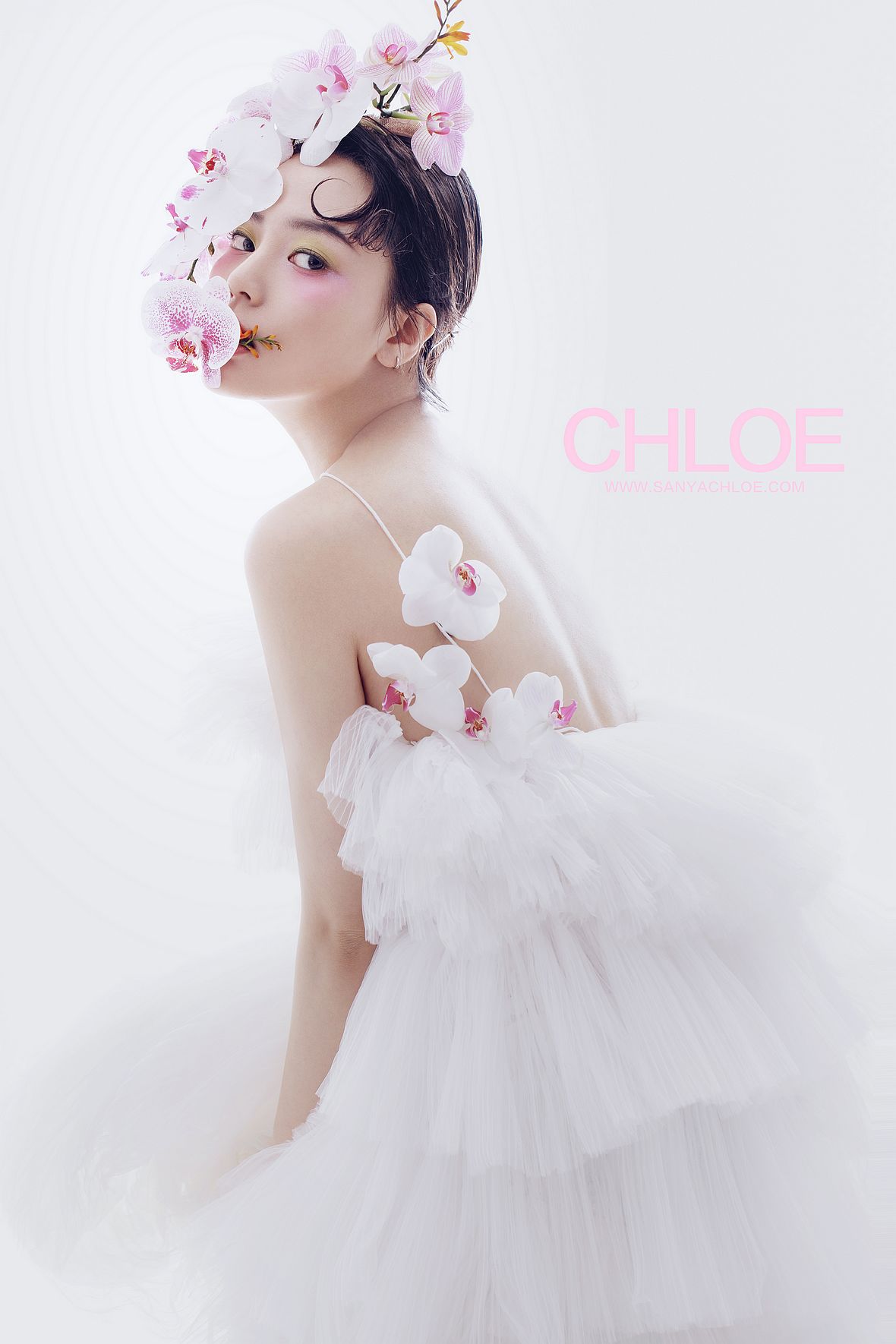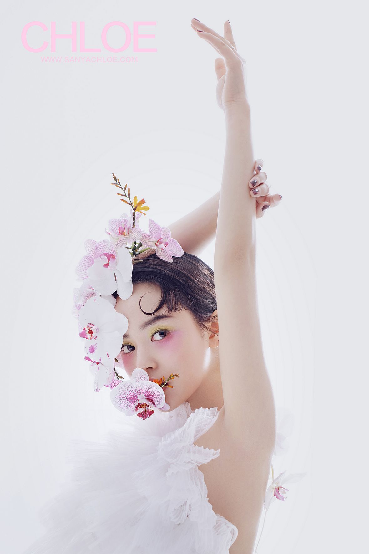 为了贴合主题,轶楠老师再次炫技,亲手制作蝴蝶兰鲜花配饰,大面积装饰在脸部一侧,这样一个大胆创意的搭配,是轶楠老师一直想要突破的传统认知里面的复古造型。