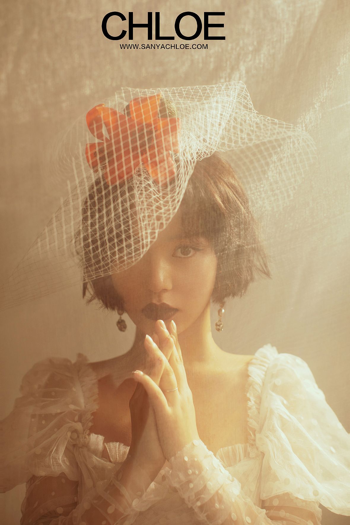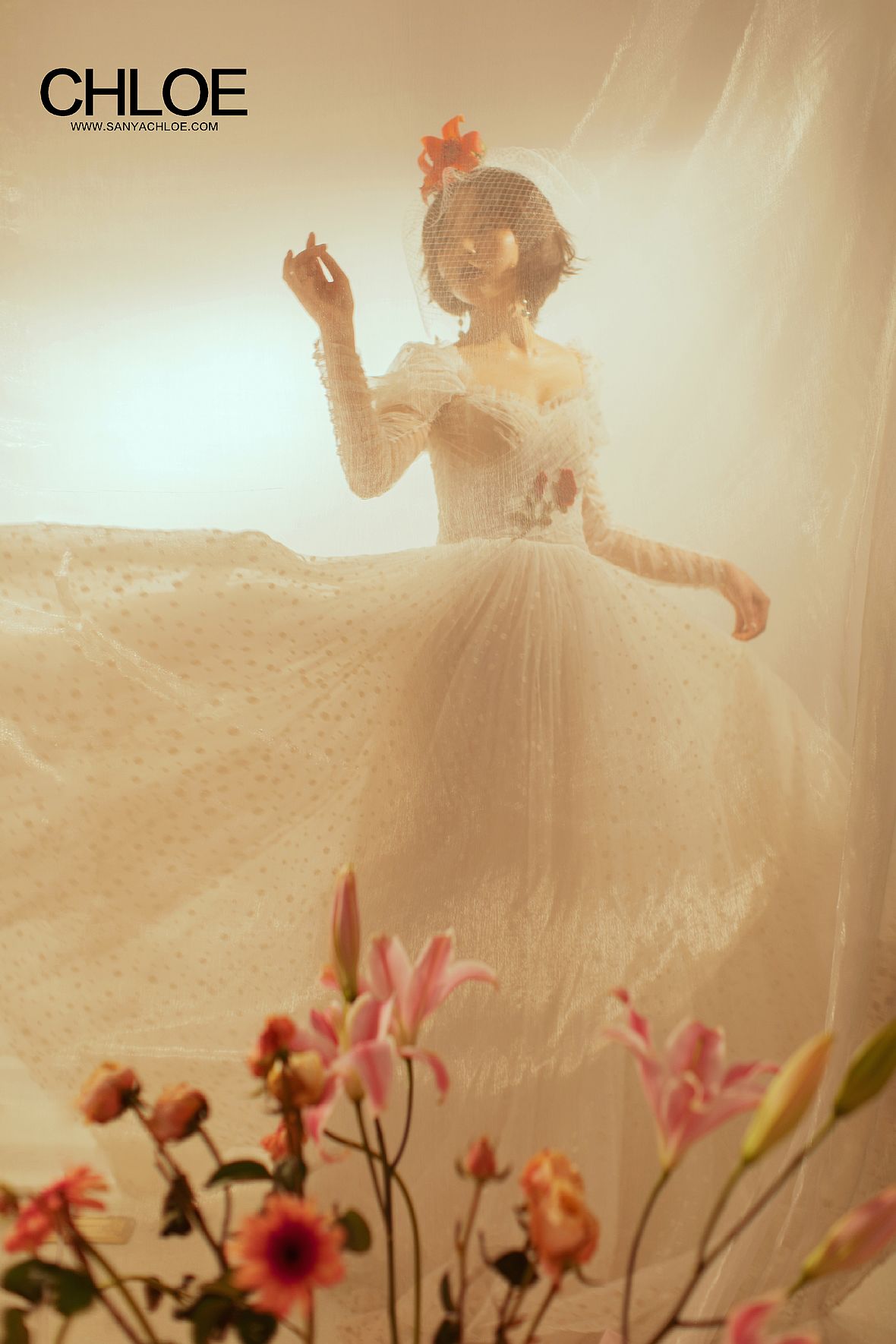 拍摄现场里,简单的白色背景前,李明歌老师透过薄纱拍摄朦胧意境的照片,一盏灯在后侧方打在模特身上,直射光影会影印在薄纱上,通过影子与人物互动的画面,呈现照片故事情感的创作表达;撤掉薄纱,鲜艳的花束场景装饰登场,使画面更加丰富。