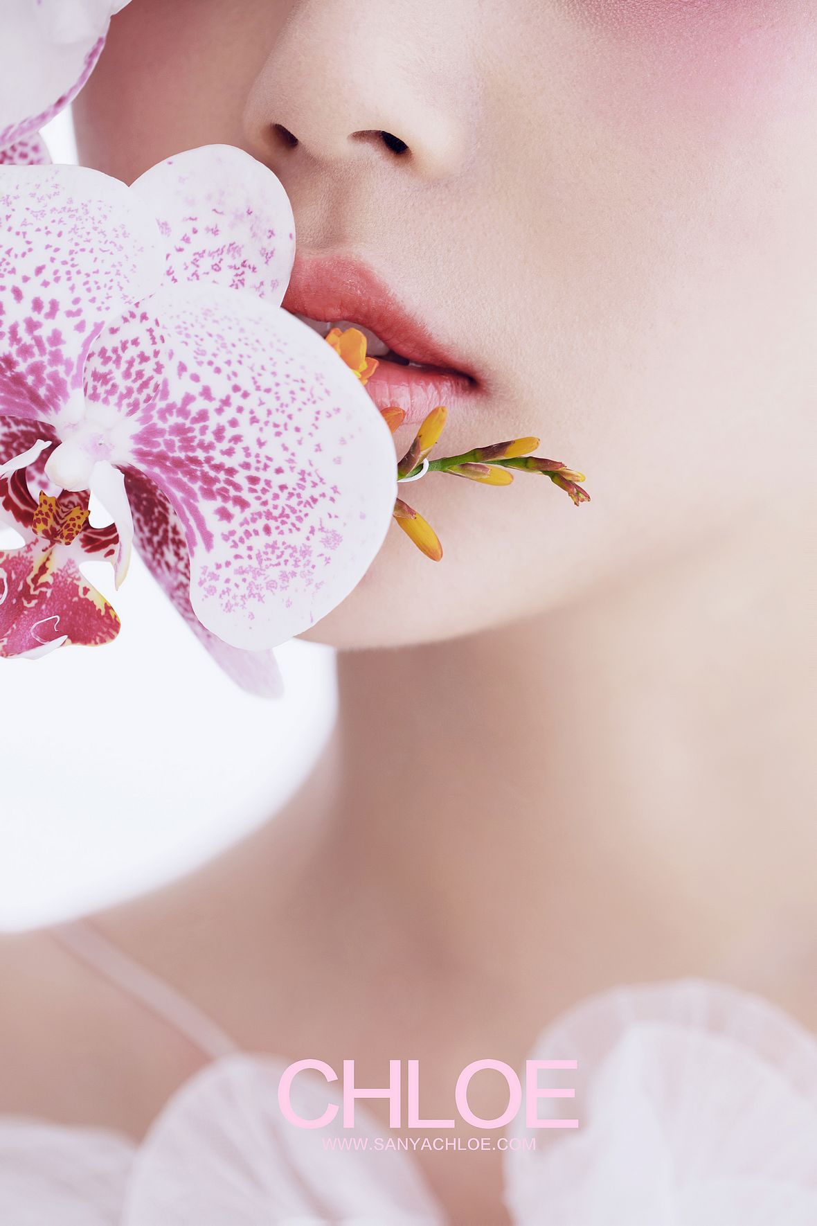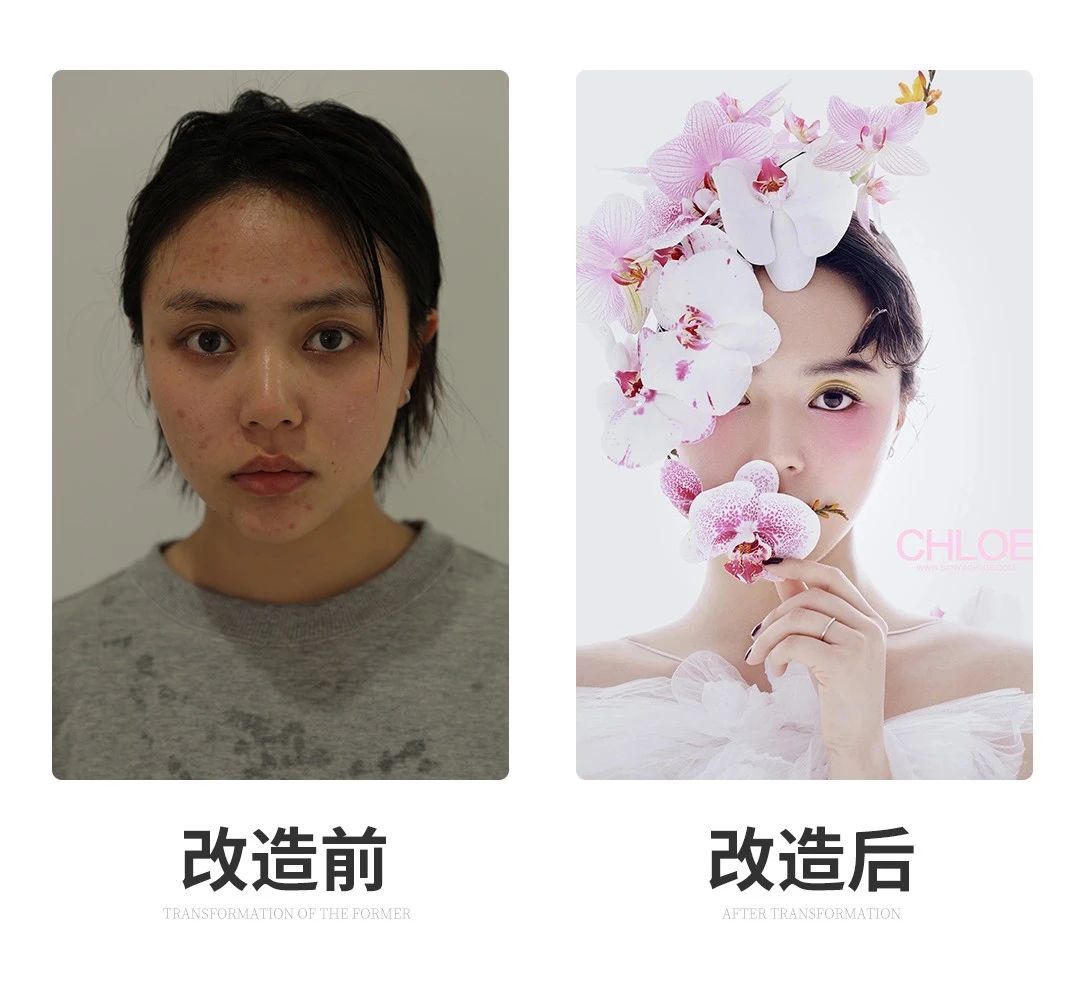唐照林老师依然是了解了造型师和摄影师的创作理念,大红色的木棉花以及紫棕色的唇妆,色彩较暗的元素决定了照片整体的亮度不能过于明亮。面部凌乱的光影柔化和谐处理,修饰人物脸部瑕疵,柔化人物颧骨棱角,唇周光影的平和过渡,凸显唇妆的存在感。这张照片中,模特的脸部下巴呈微微扬起状态,下巴处不宜过小,适当液化下巴的比例;发型过于厚重,影响脸部视觉美感,处理发量让人物更加小巧精致;微调人物眼睛、手部、脖子之间的比例。