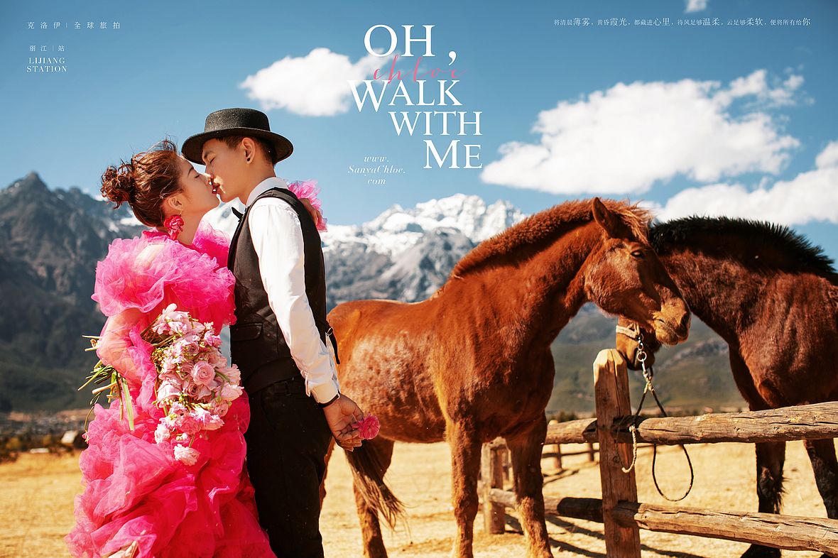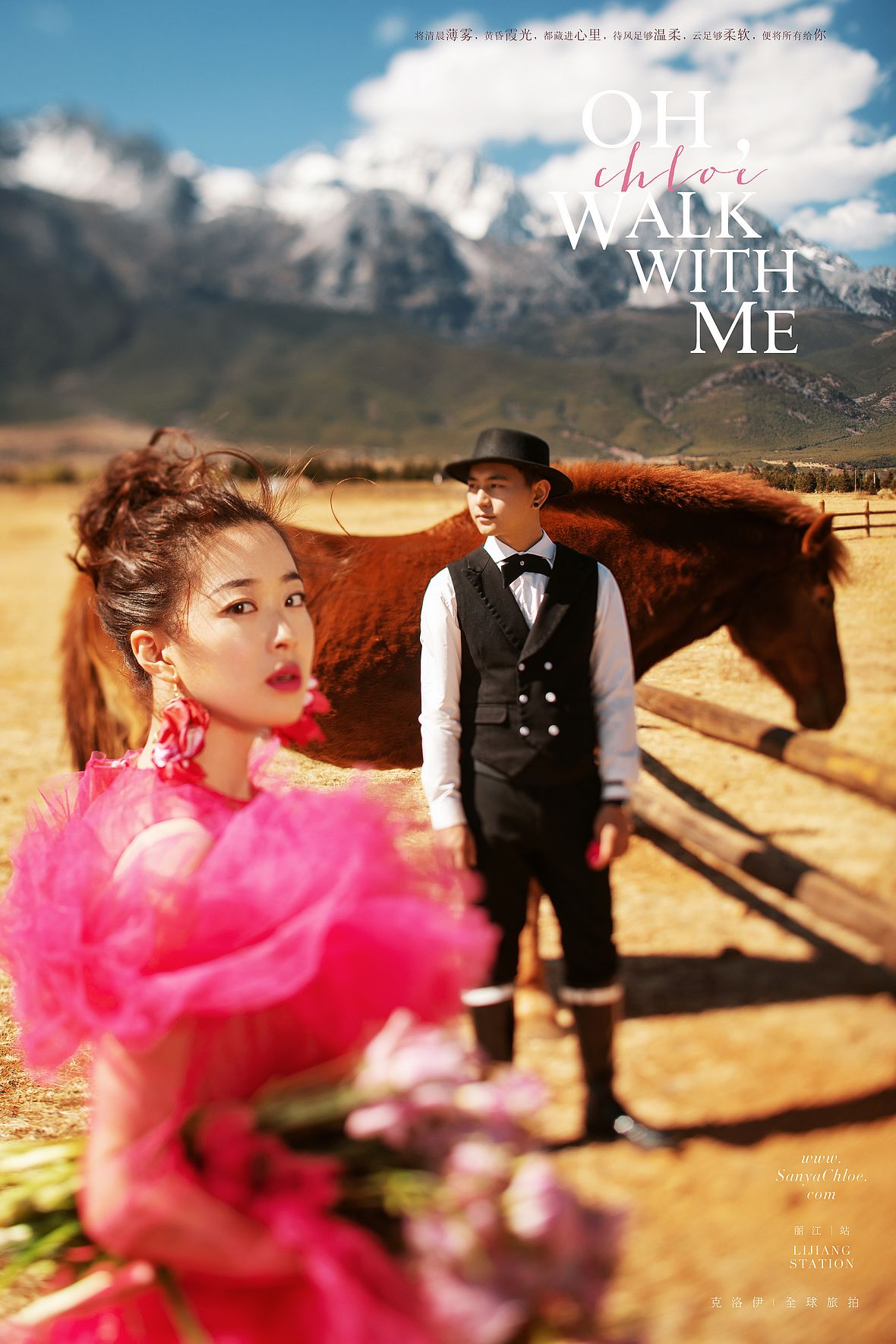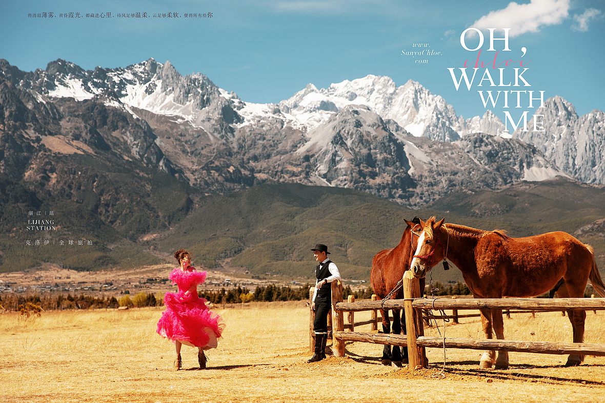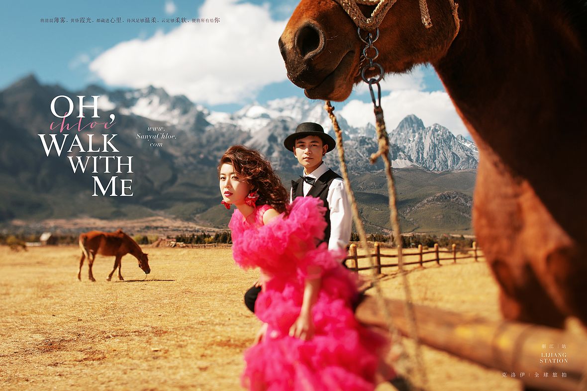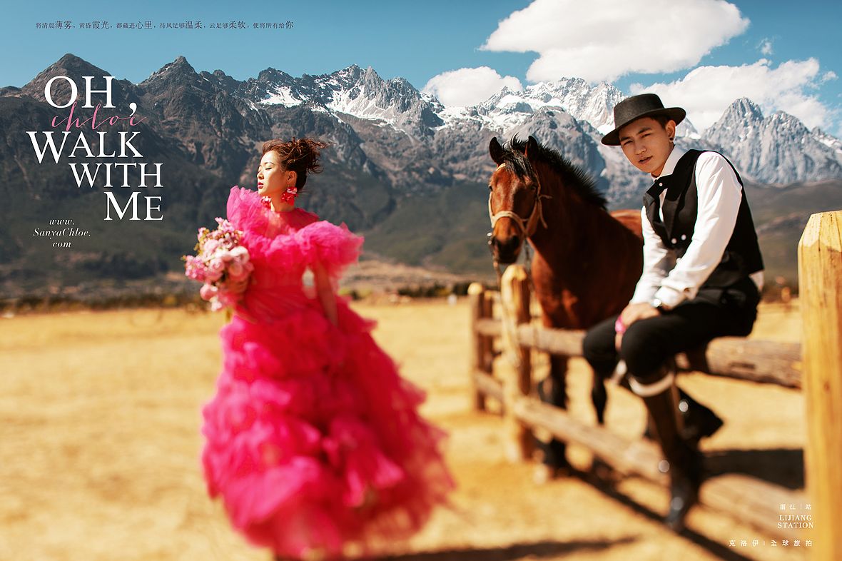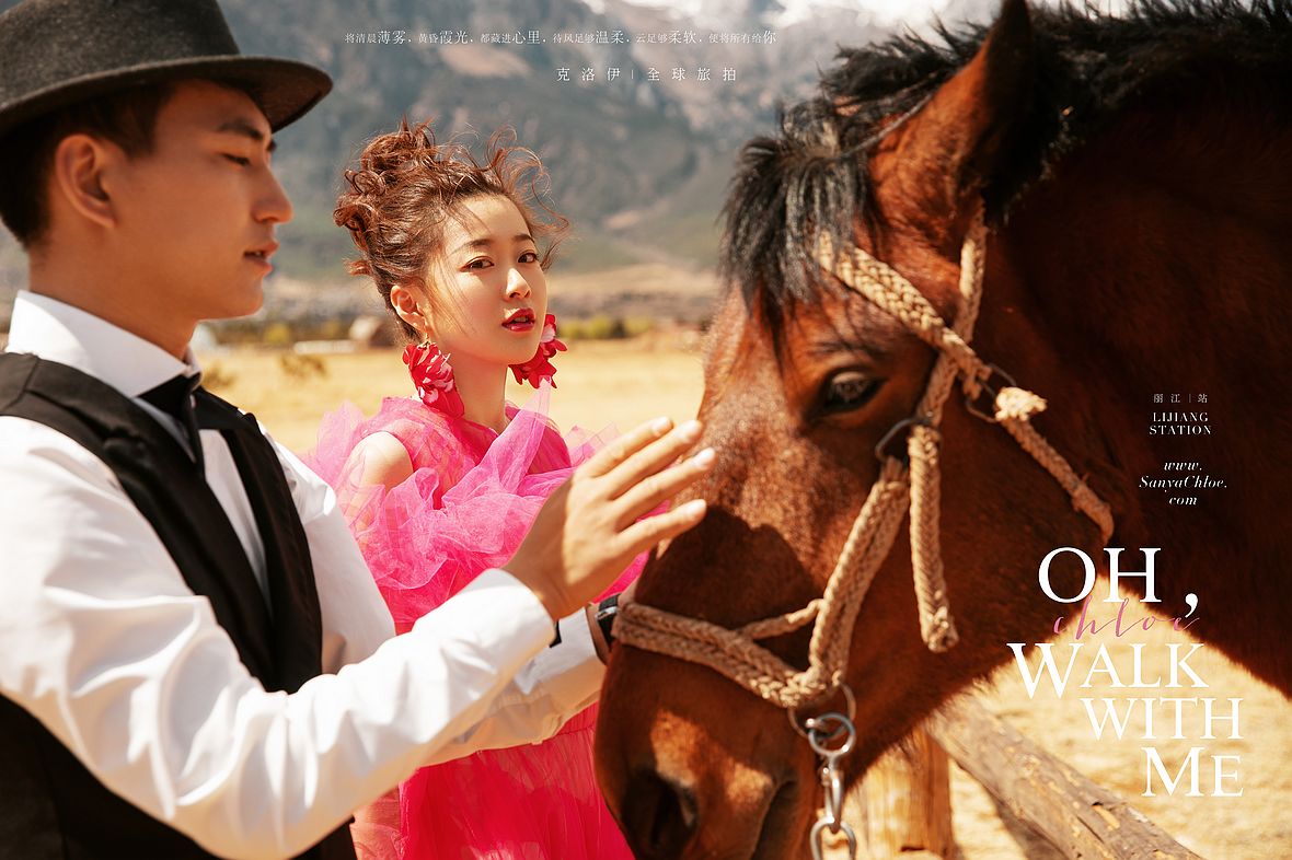 雪山巍峨,云朵缤纷,不同于其他马场婚纱照风格,这里更有西南地域的色彩。这不仅是来自丽江的文化渲染,更归功于克洛伊创作团队的精心制作。