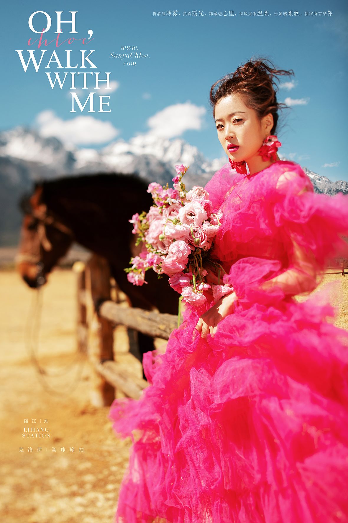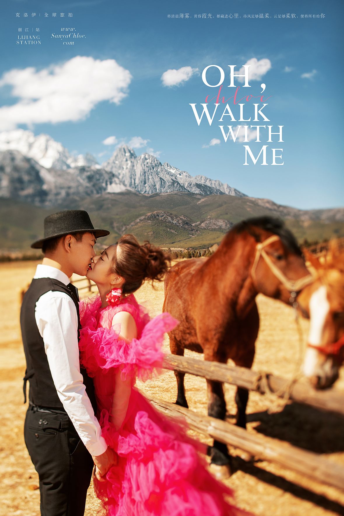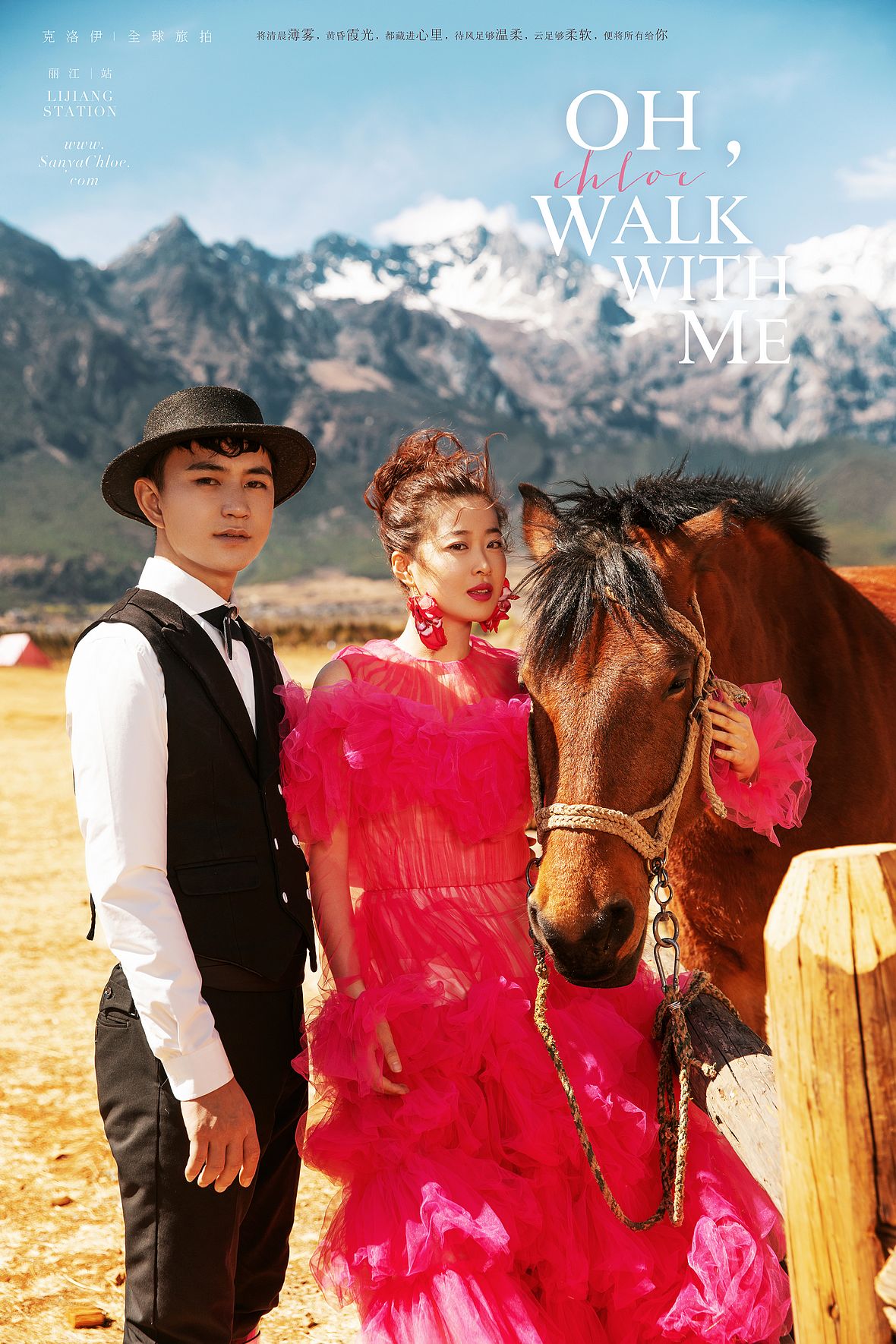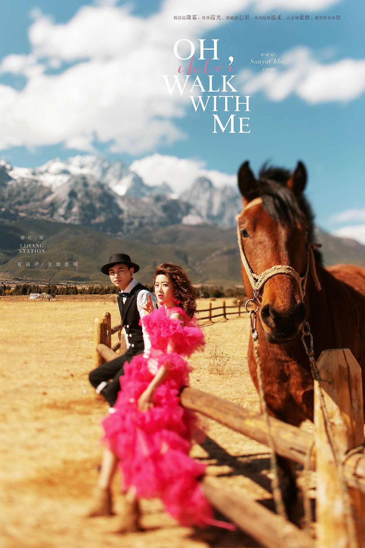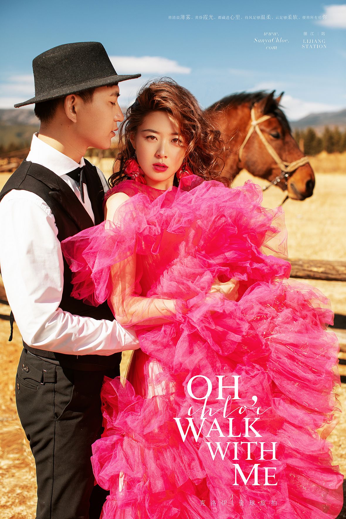 雪山巍峨,云朵缤纷,不同于其他马场婚纱照风格,这里更有西南地域的色彩。这不仅是来自丽江的文化渲染,更归功于克洛伊创作团队的精心制作。