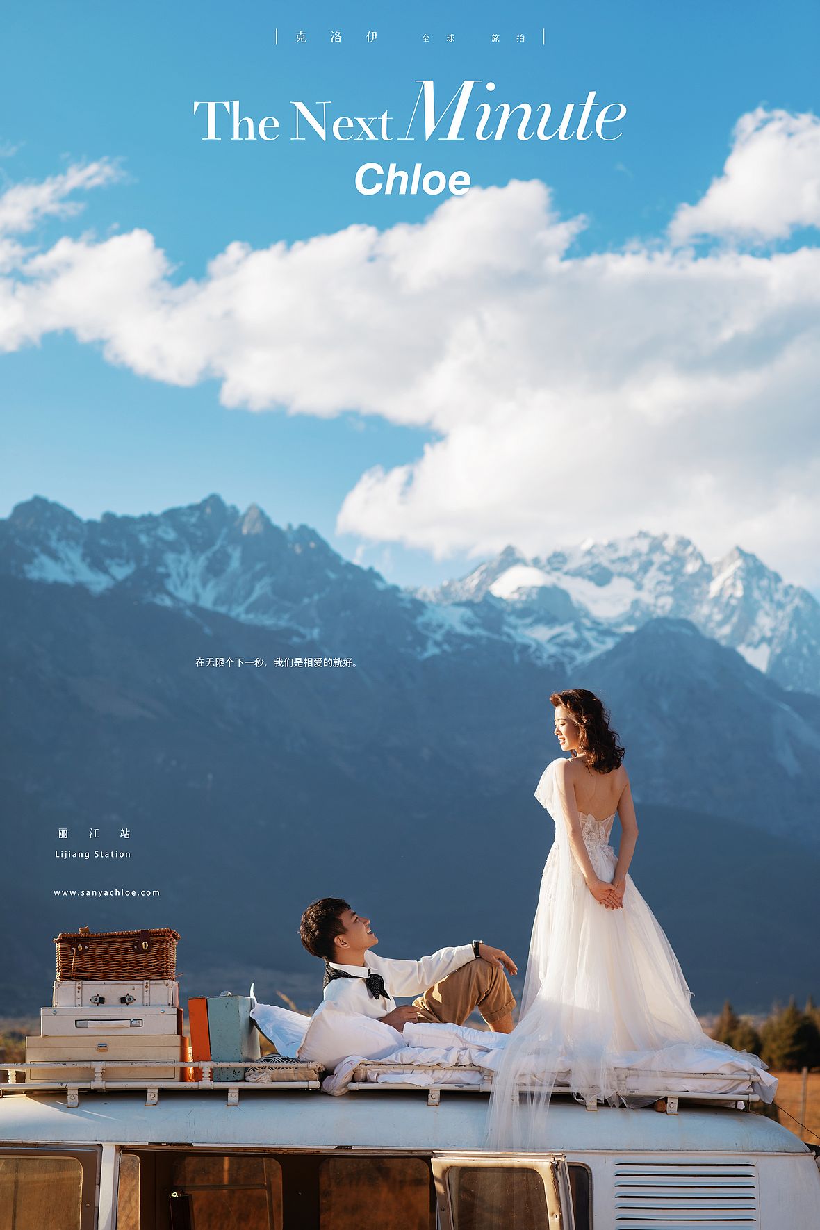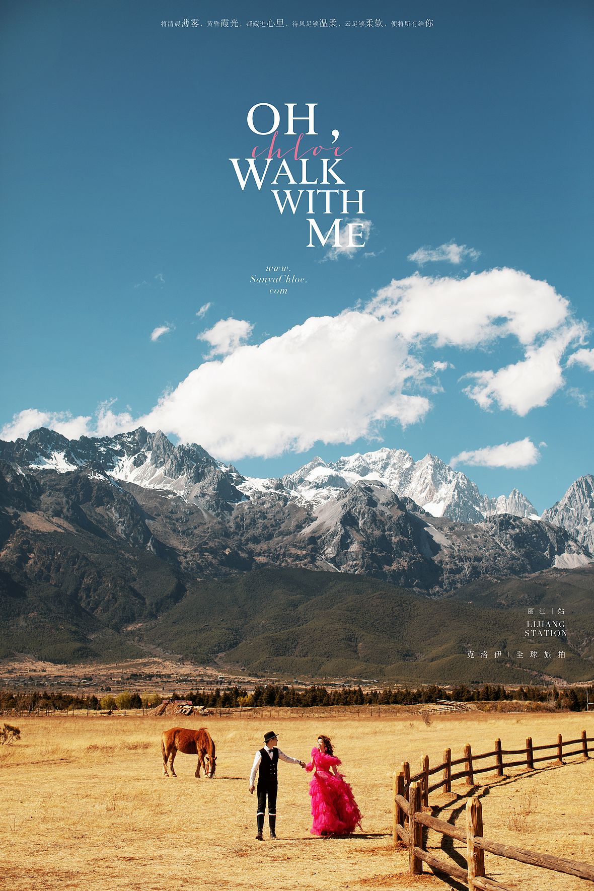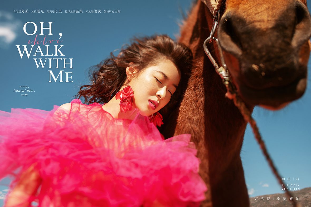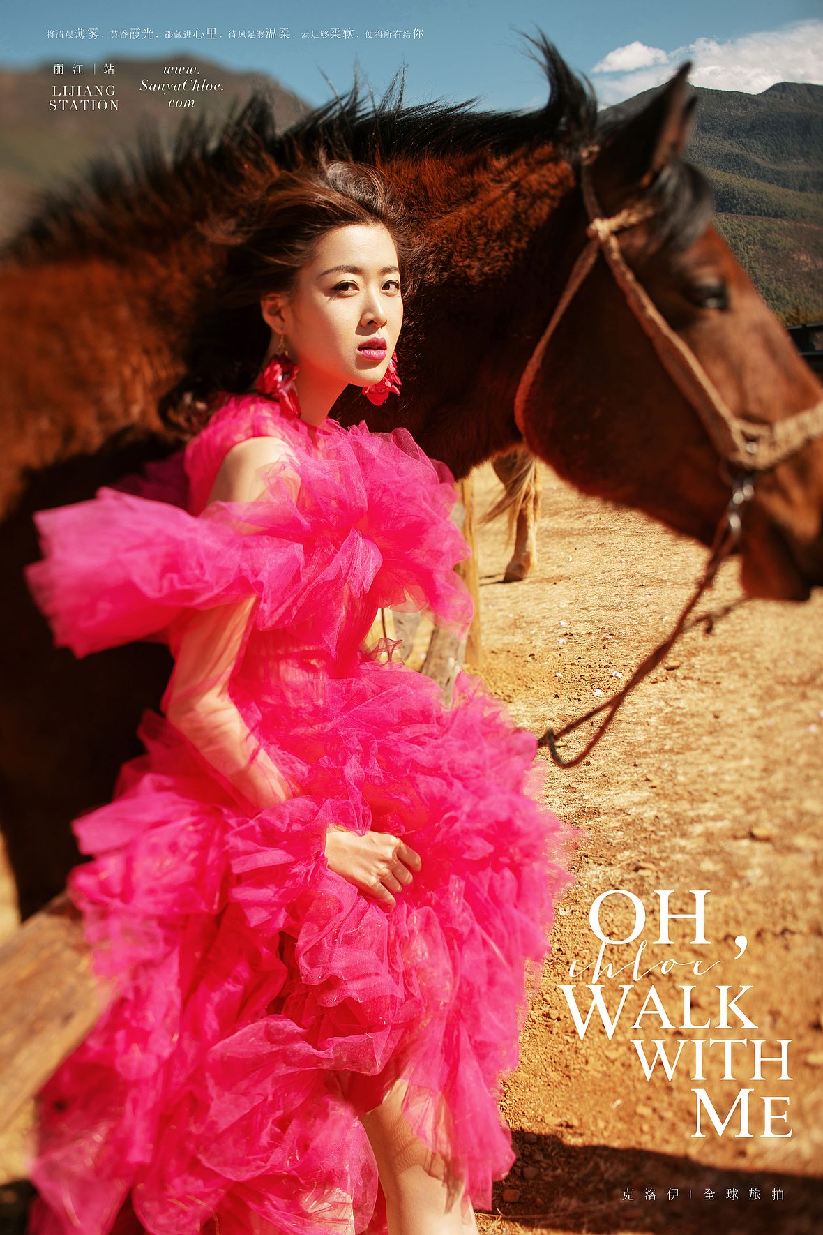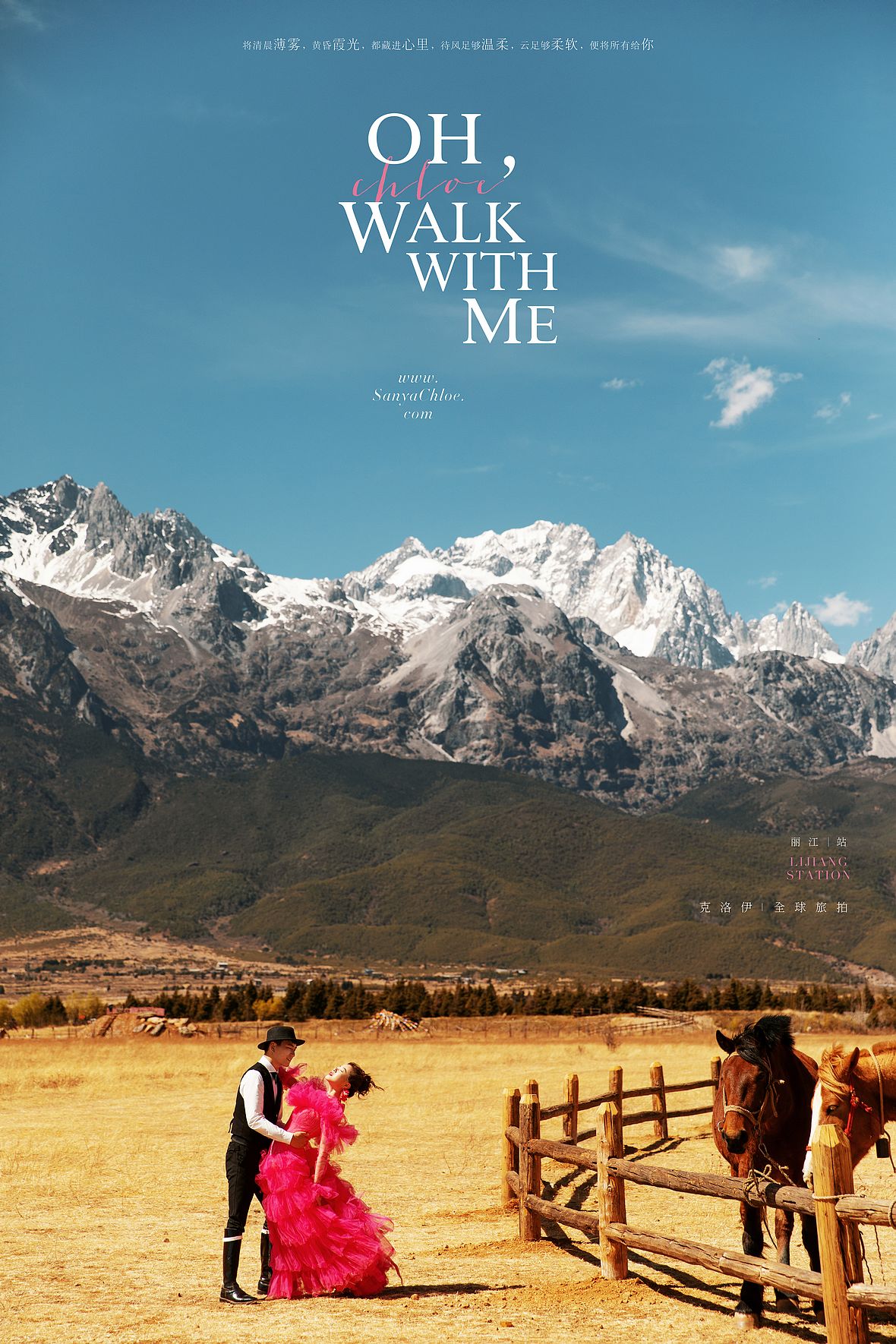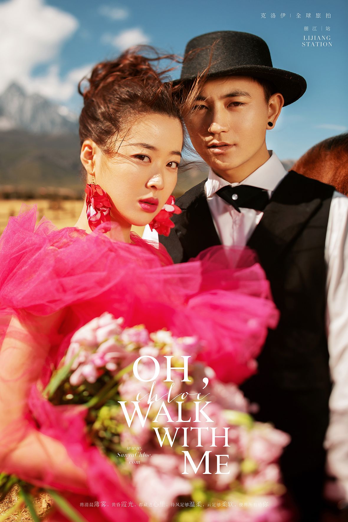 雪山巍峨,云朵缤纷,不同于其他马场婚纱照风格,这里更有西南地域的色彩。这不仅是来自丽江的文化渲染,更归功于克洛伊创作团队的精心制作。