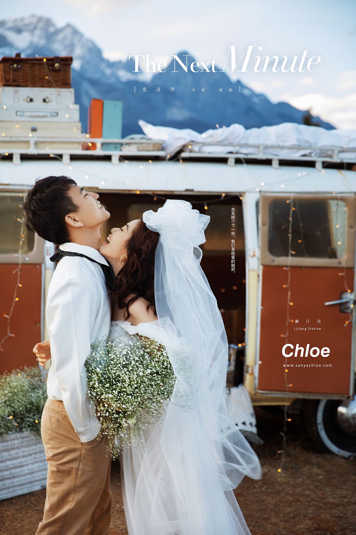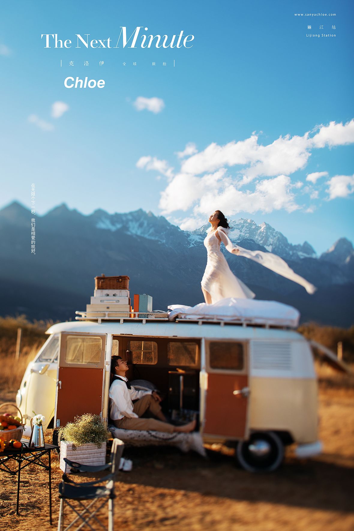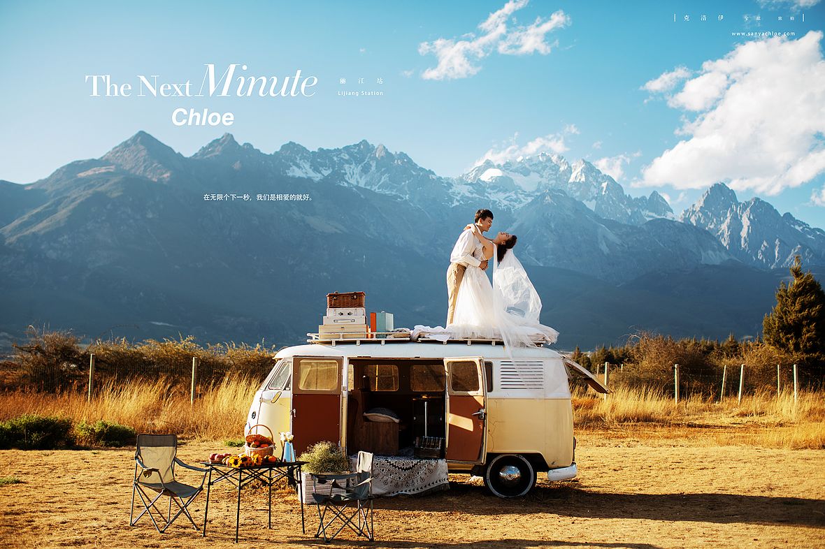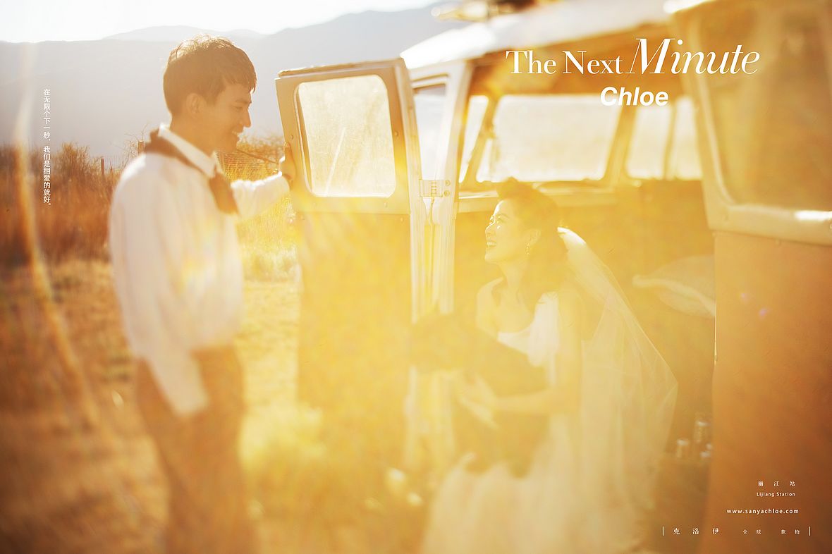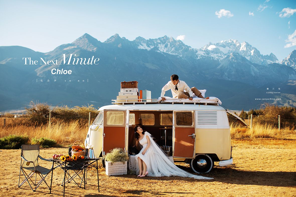 在午后的山色中,结合复古巴士的温馨元素,利用其功能,在车顶、车里或是车旁,克洛伊全球摄影师阿龙将情侣甜蜜互动定格成像。