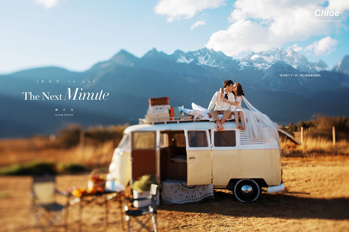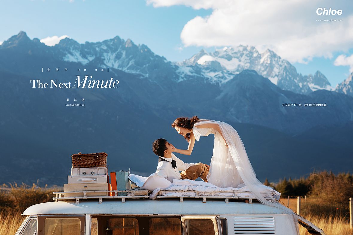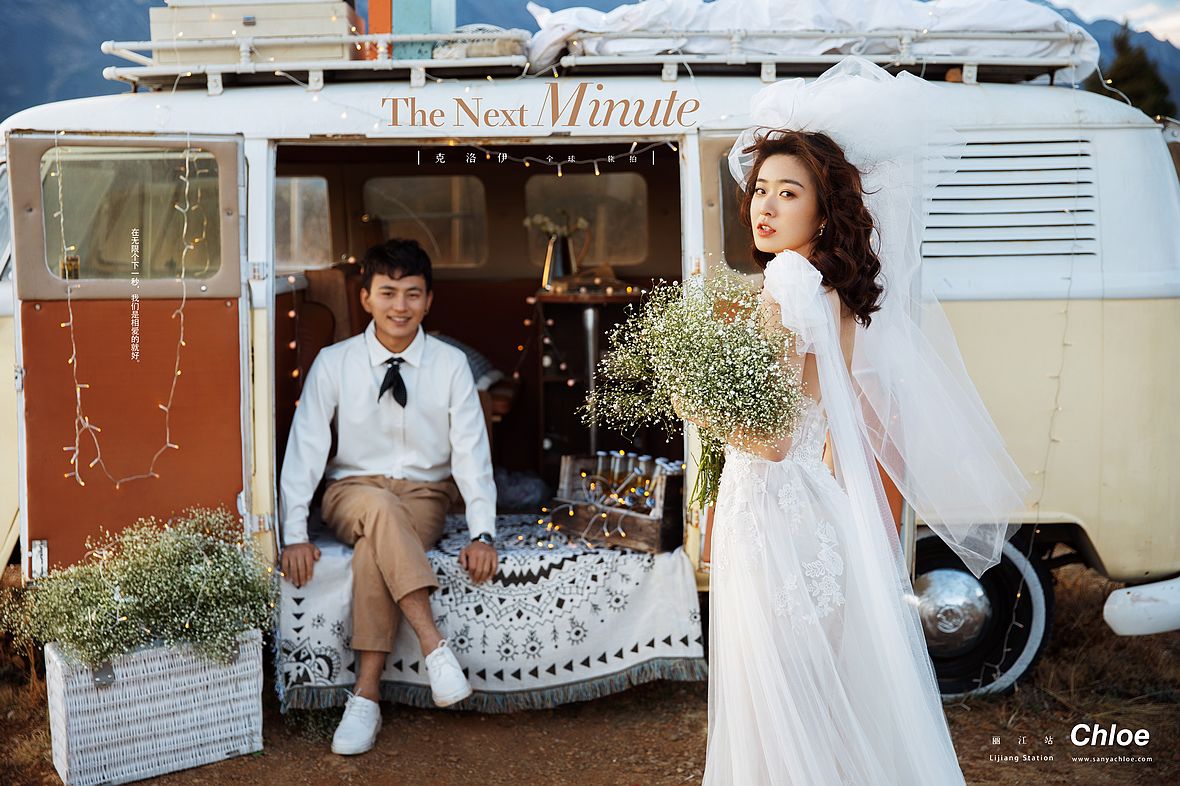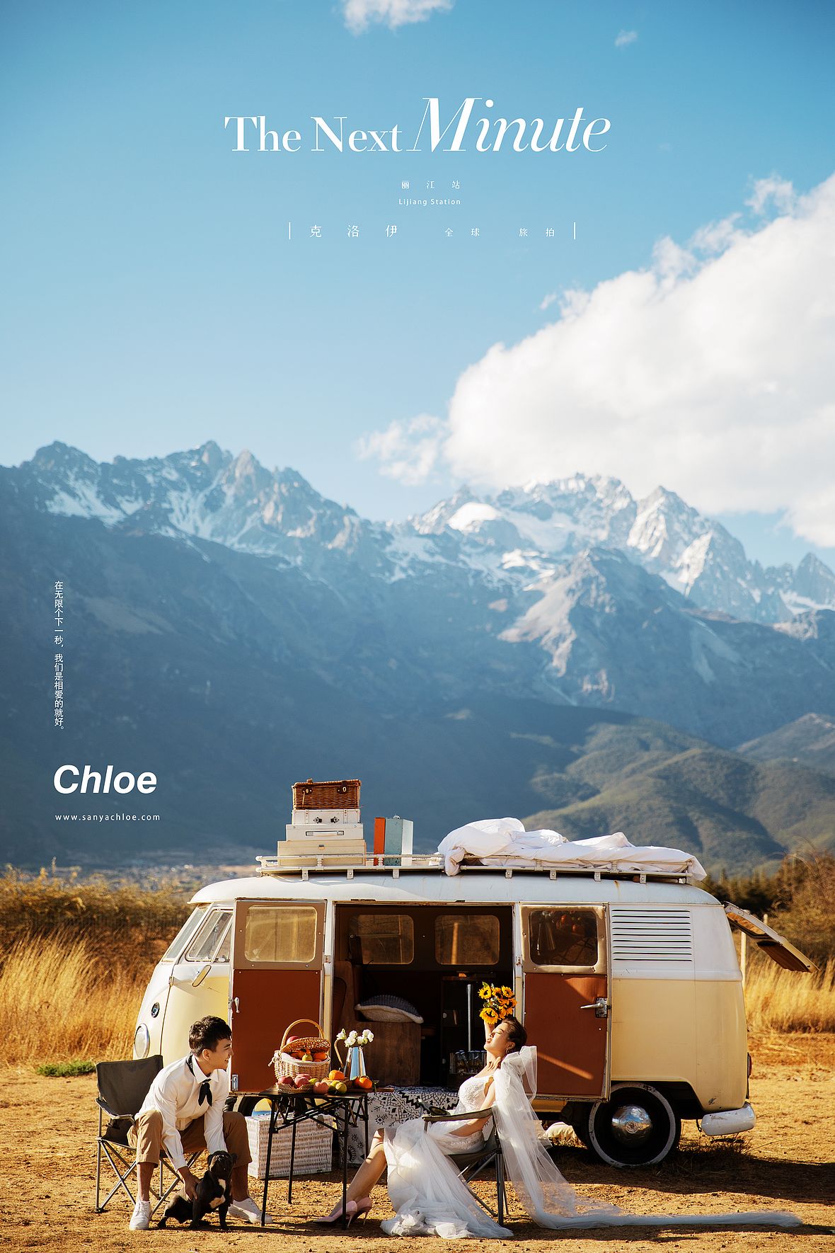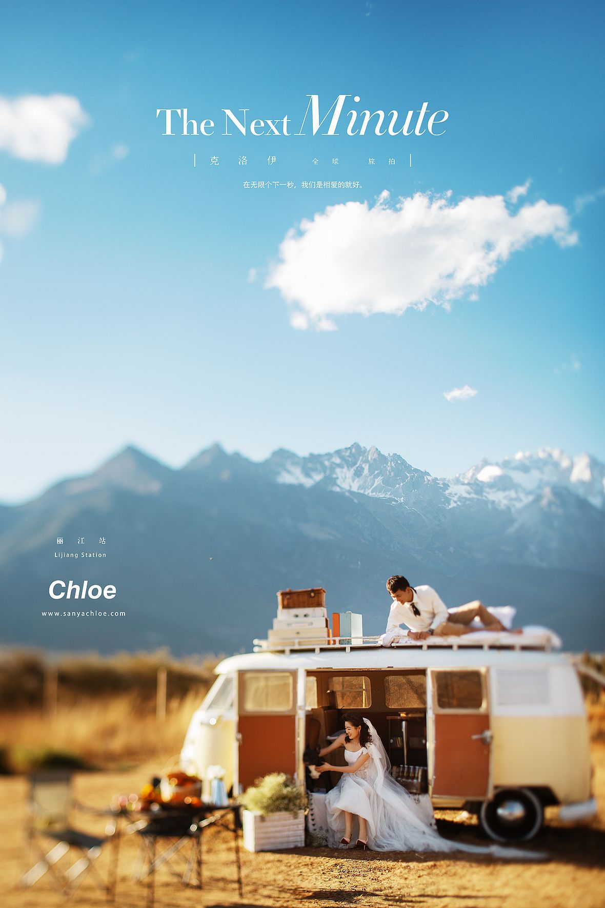在午后的山色中,结合复古巴士的温馨元素,利用其功能,在车顶、车里或是车旁,克洛伊全球摄影师阿龙将情侣甜蜜互动定格成像。