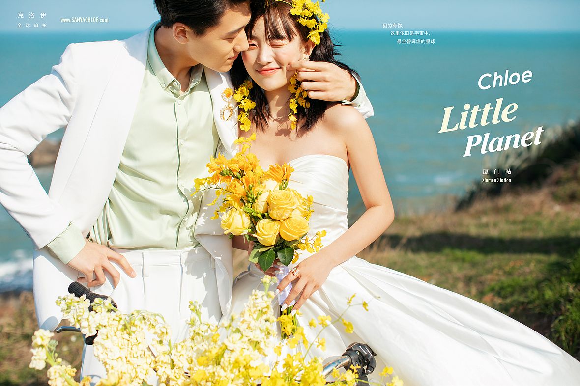 载满鲜花的法式小单车,像是载着整个春天,停在了这个风和日丽的海边悬崖。在这个悬崖上,可一览厦门湾火山地质公园的半壁江山,和心爱的人牵手相依,看看海天一色的风景,享受和风温柔的浪漫。