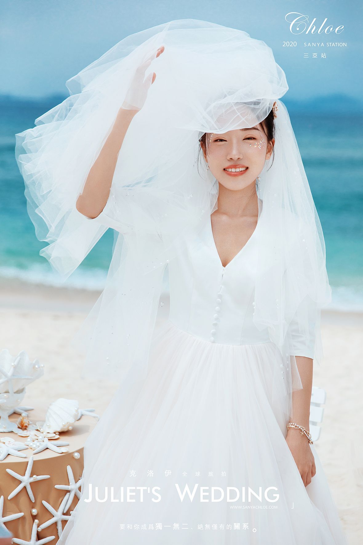 服装搭配上,女生选择的一款v领中袖婚纱。V字领的设计,让女生更加的有女王的气质,柔软飘逸的轻纱,在蓝天、大海和白沙滩的映衬下,显得唯美梦幻。