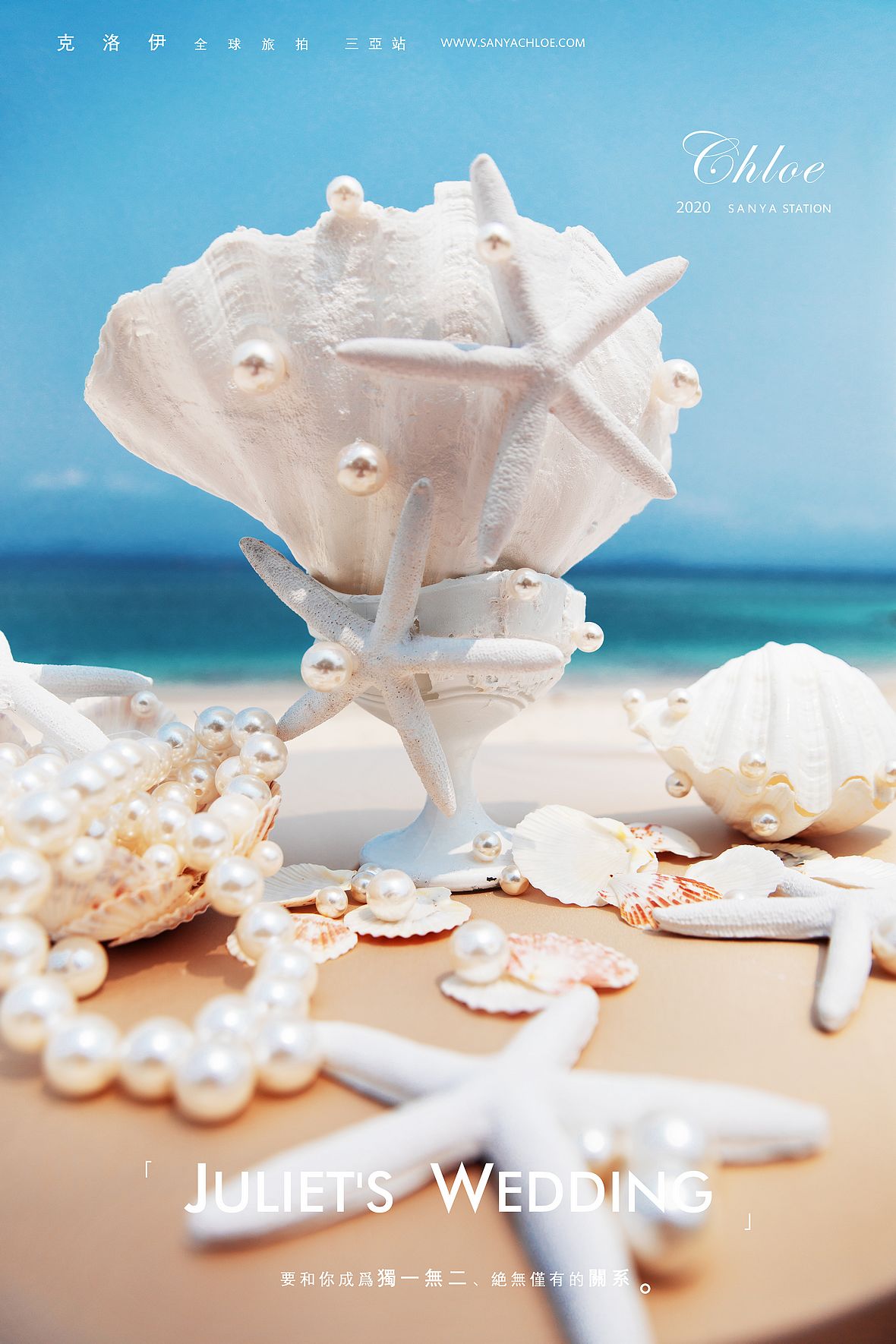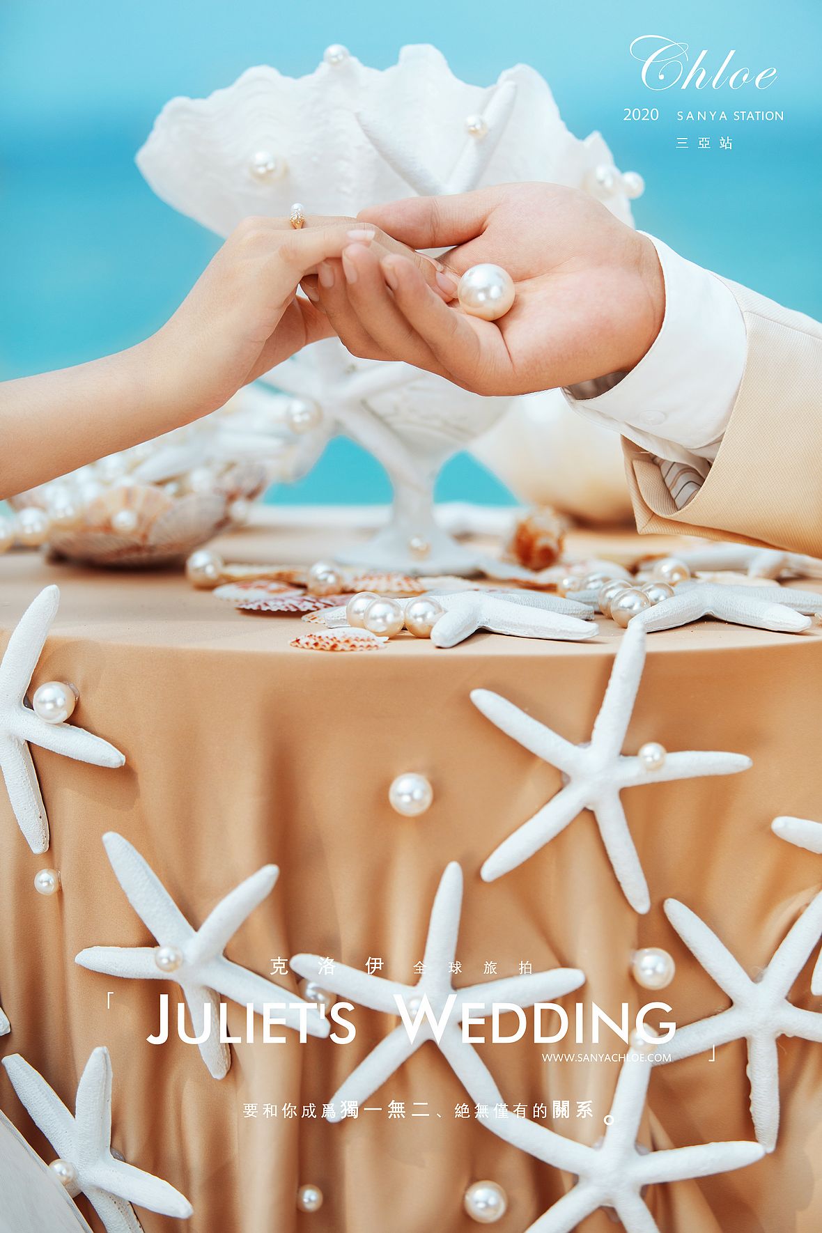 海洋婚礼的典礼,琳琅满目的“海洋珠宝”,海星装饰的圆桌满满的海洋气息;贝壳、珍珠陈列其上,那都是闪着美好祝愿的大海的礼物。