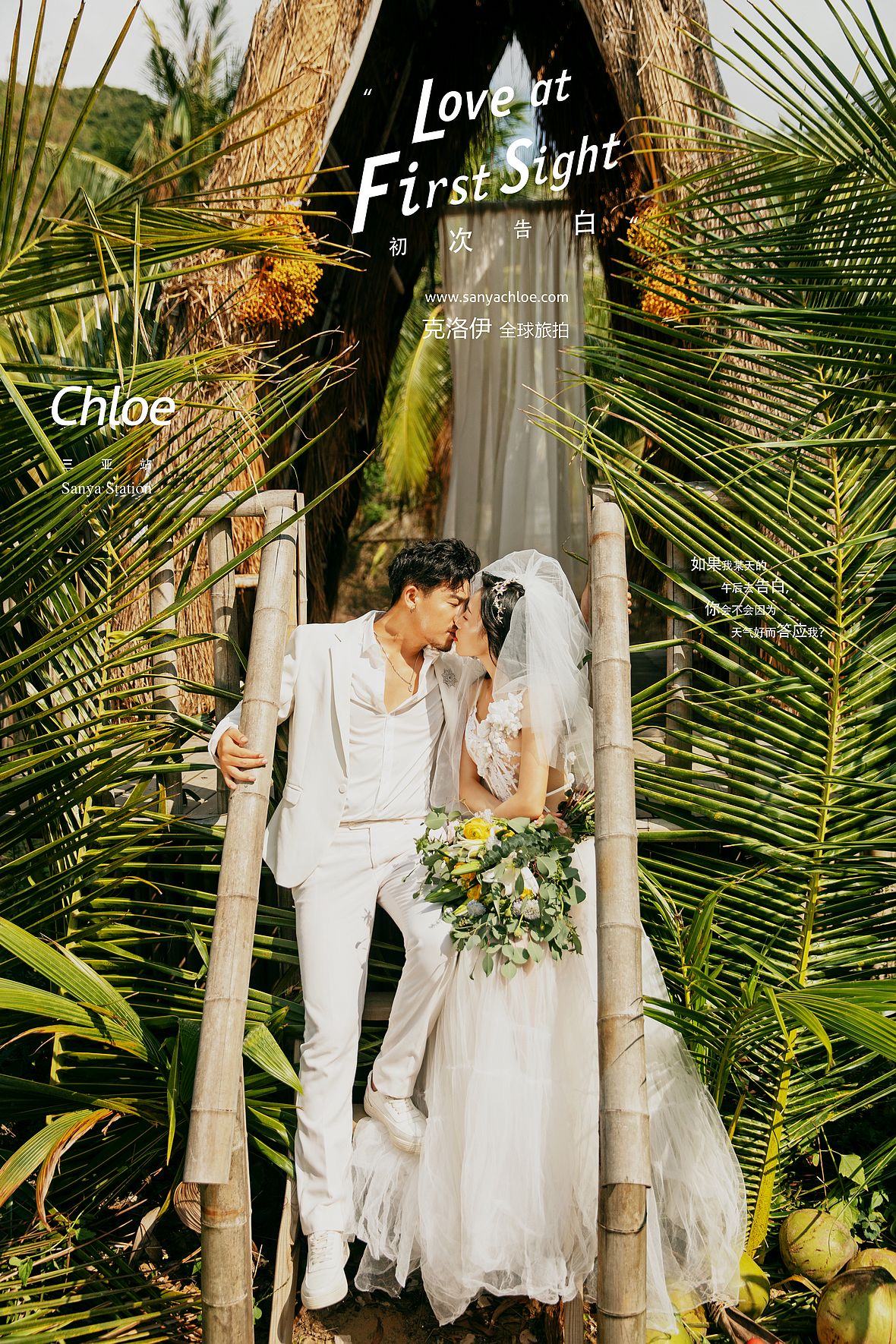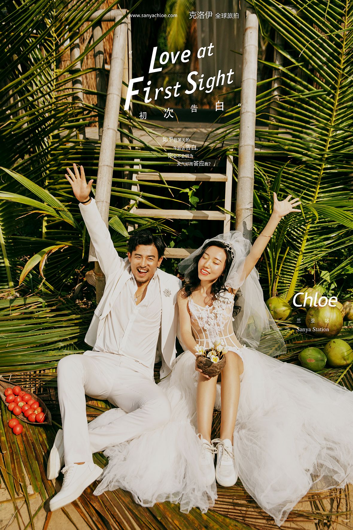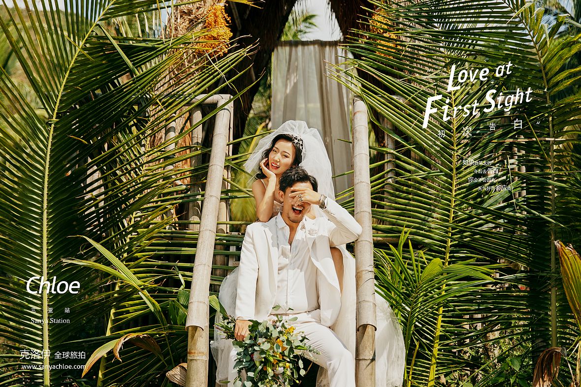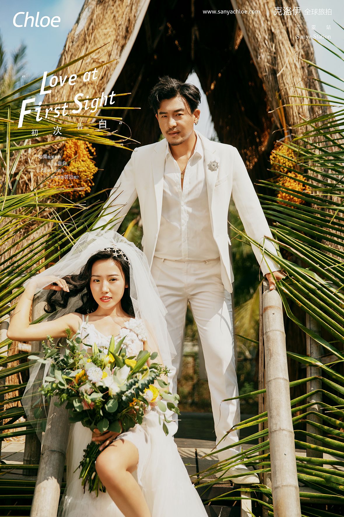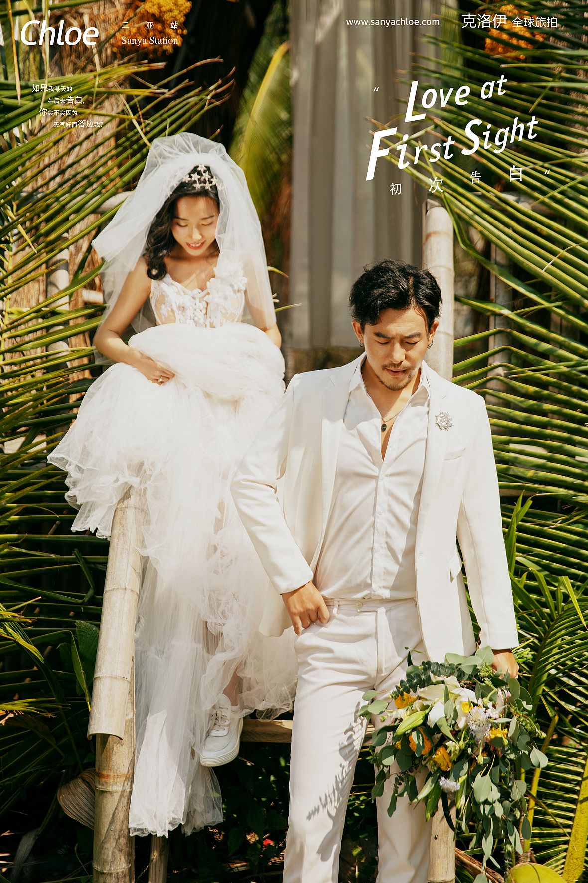 吊带v领婚纱,鱼骨外置的腰身设计,朦胧纱料透着些许小性感,裤裙裙摆时尚个性,衬托出女生娇小玲珑。男生全白西装套装,绅士感十足。男女生纯白色的服装搭配,在这绿意浓浓的热带森系背景里,显得那么的和谐美好。