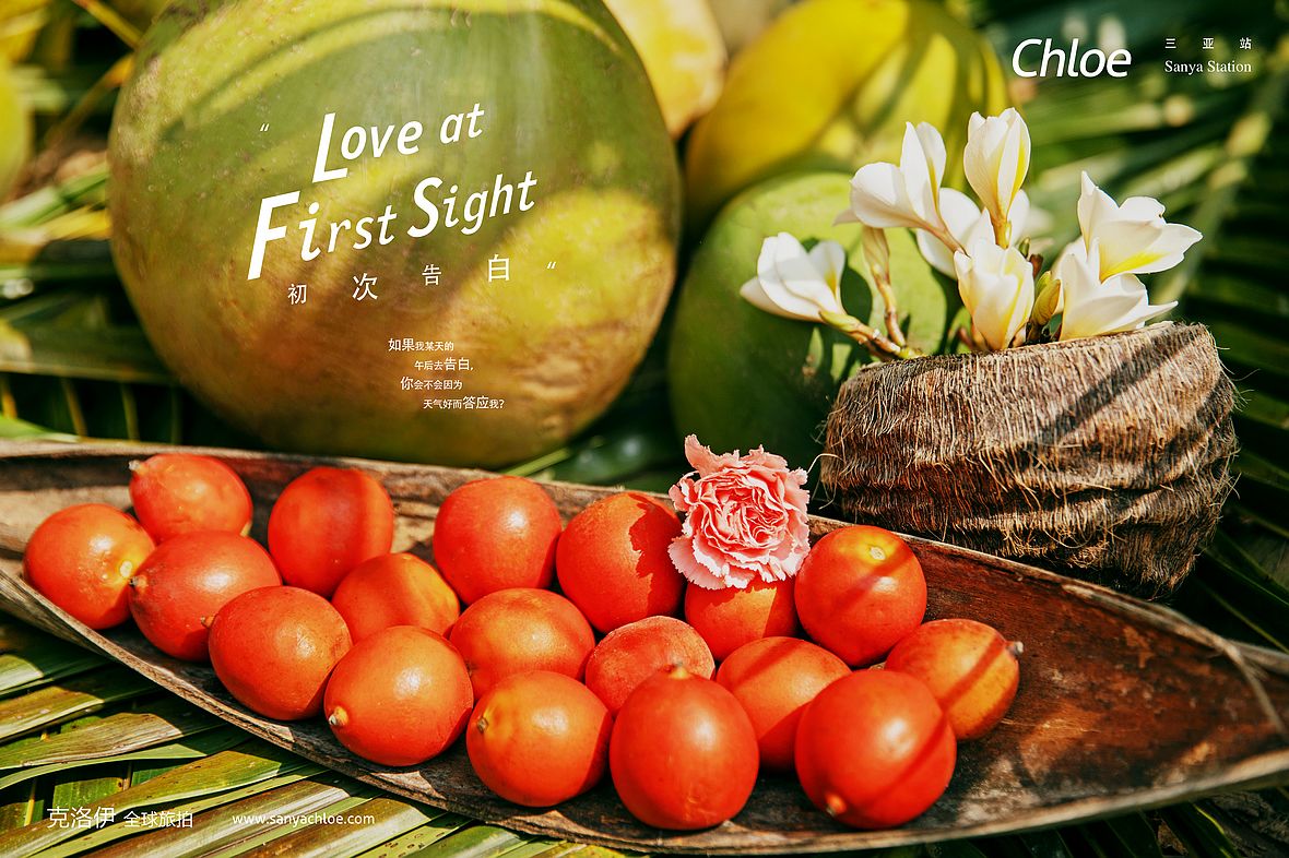 克洛伊美学大师在小屋的基础上,加入椰树叶、叶子、槟榔果、刺葵等岛内随处可见的热带植物元素,丰富拍摄背景的层次感,营造热带森系主题氛围感。