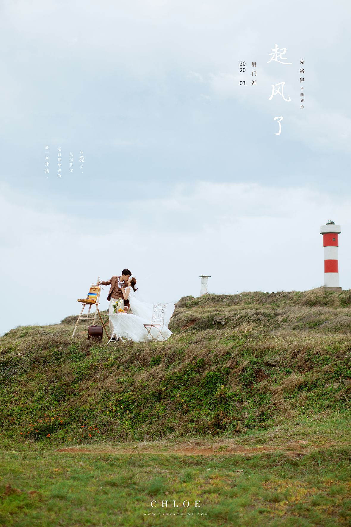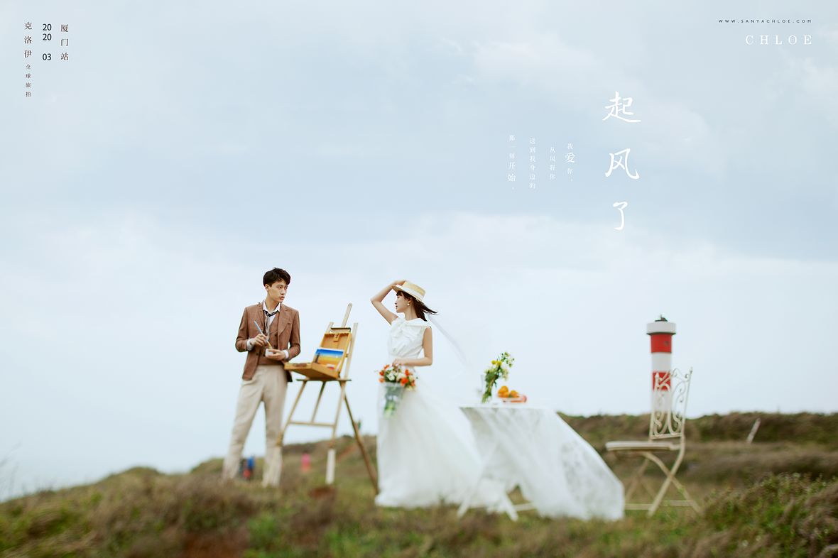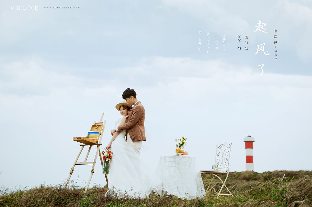 文艺气息的画板,婚礼仪式感的小圆桌,在面朝大海,矗立着灯塔的山坡上,风带来阵阵清凉,扬起女生穿的纱,飘向男生的胸前,他们,被这里的风祝福了。
