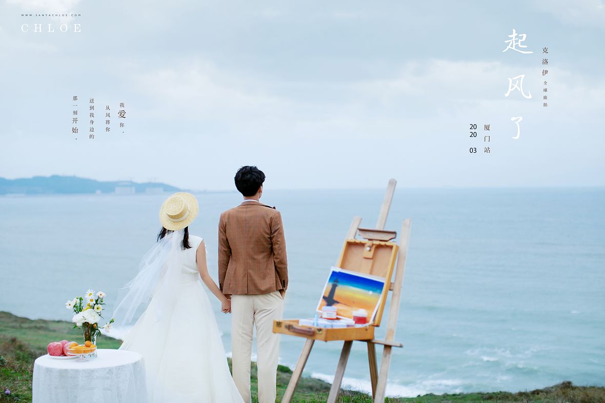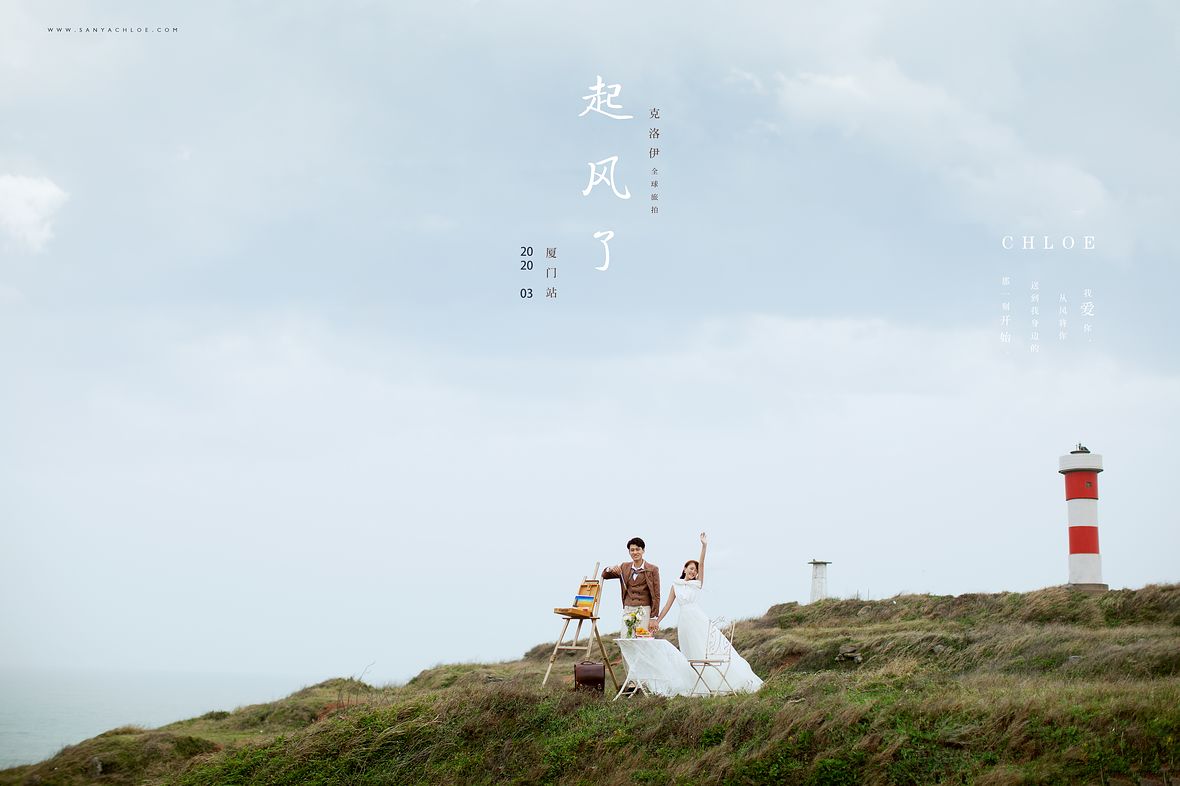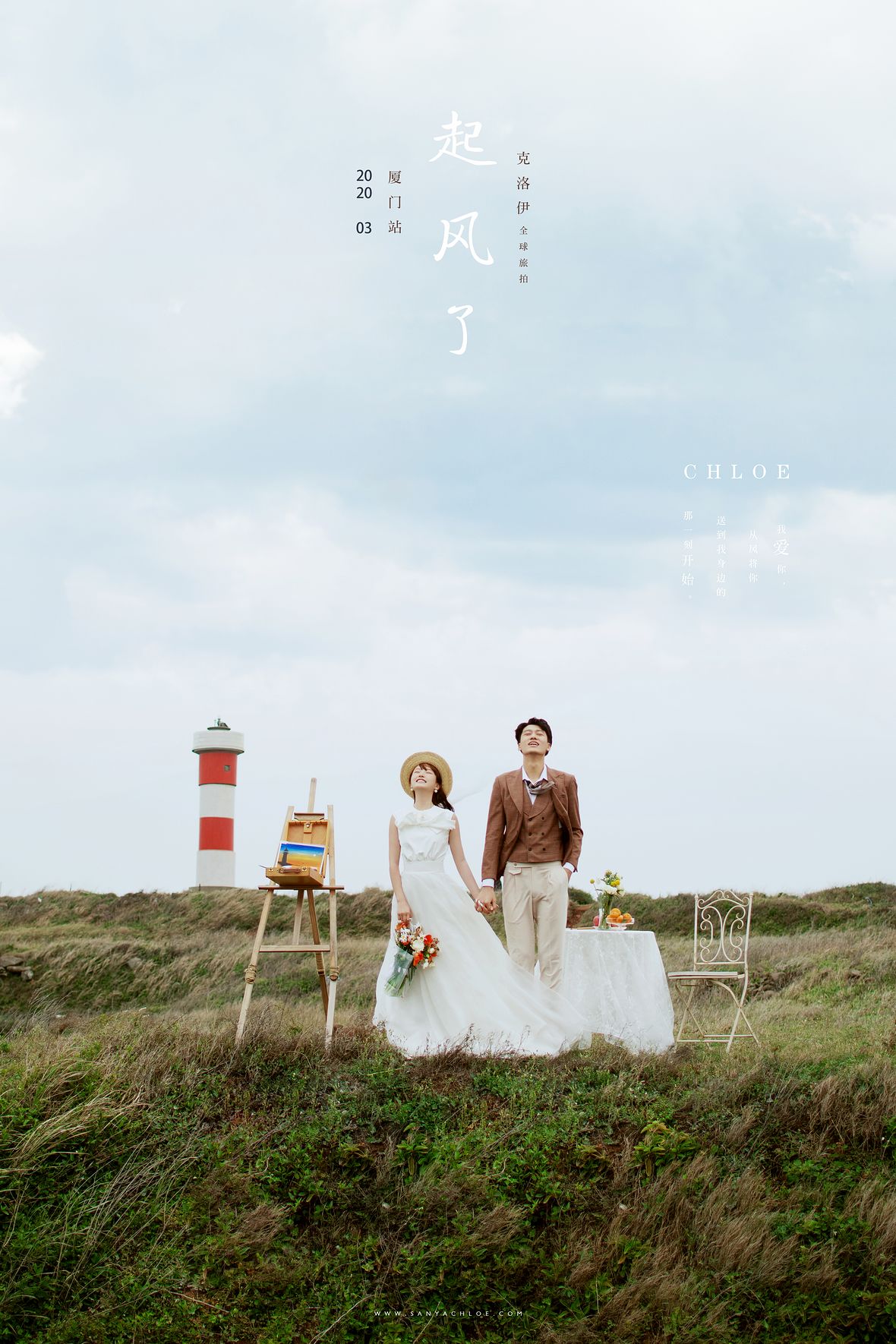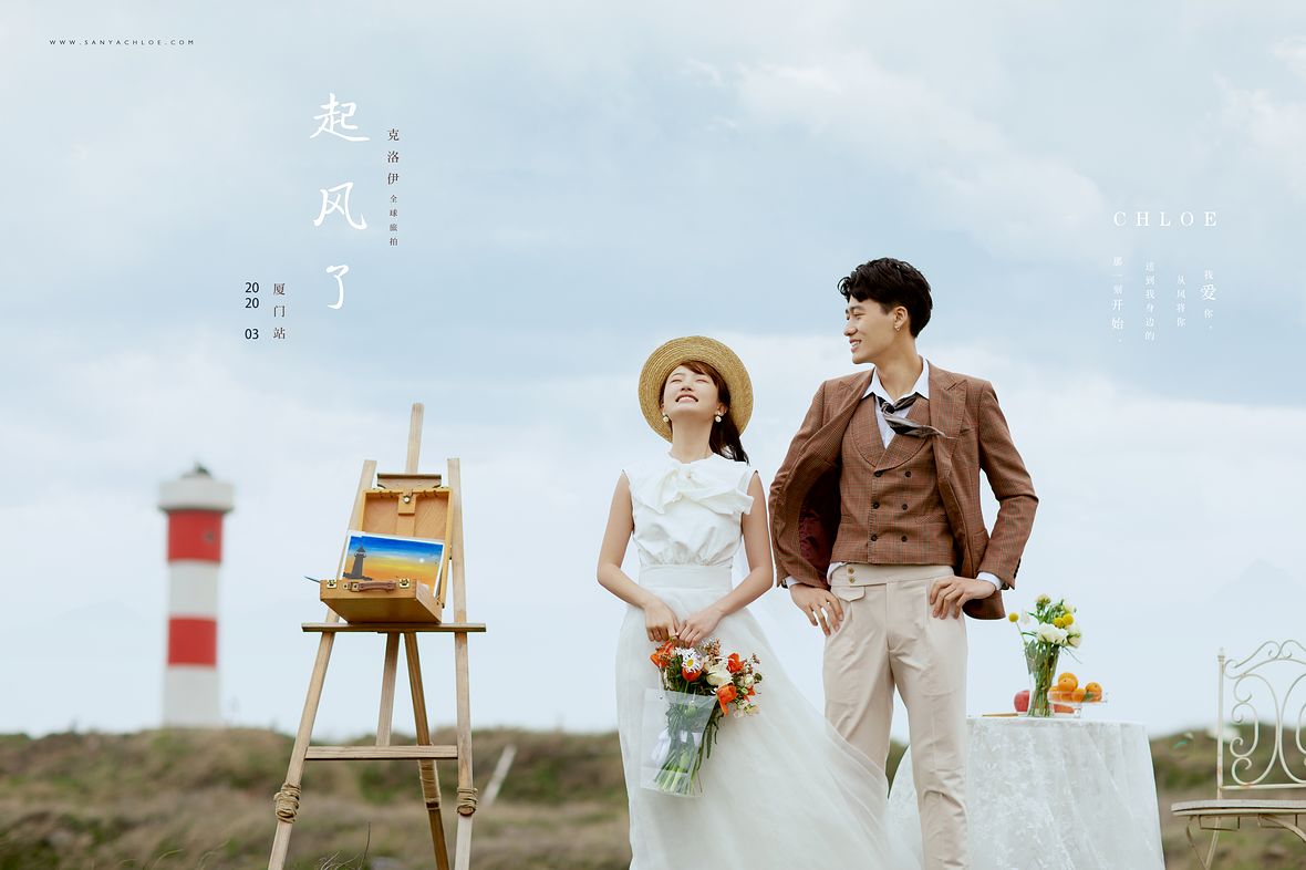 文艺气息的画板,婚礼仪式感的小圆桌,在面朝大海,矗立着灯塔的山坡上,风带来阵阵清凉,扬起女生穿的纱,飘向男生的胸前,他们,被这里的风祝福了。